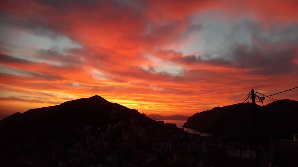Sorry to start the day with a bit of an odd question, but I couldn’t think of anything else to start with. I’m just back from a short walk up a long hill and keen to press on with my editing as proofing day approaches. I was sitting at the kafenion the other day, looked up and saw this, and to me, it looked like an ostrich. You will immediately assume I was drinking, and you would be right. I was drinking a frappe, and I don’t usually have caffeinated coffee, so perhaps it was a hallucination as a result of the caffeine. Whatever… This sunrise was not a hallucination, I can tell you.*