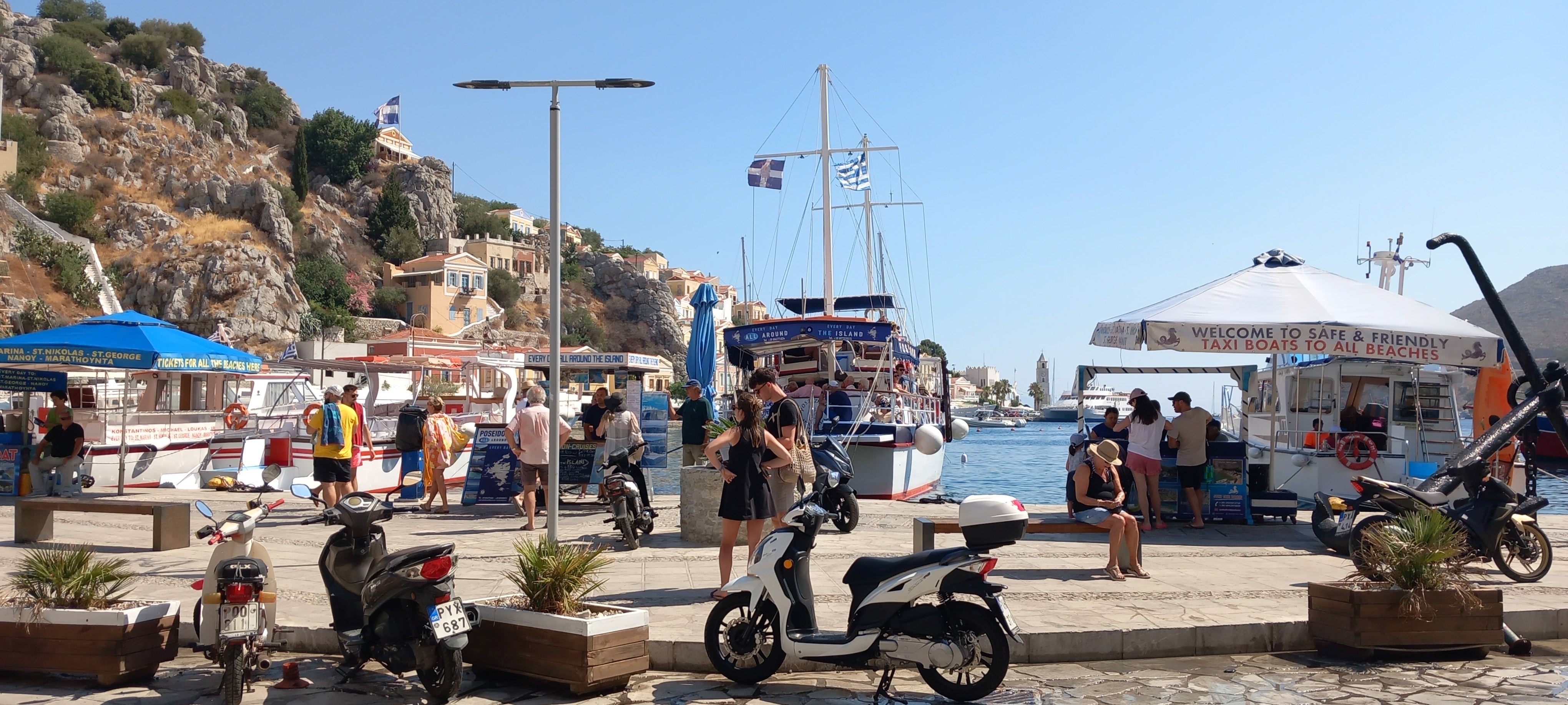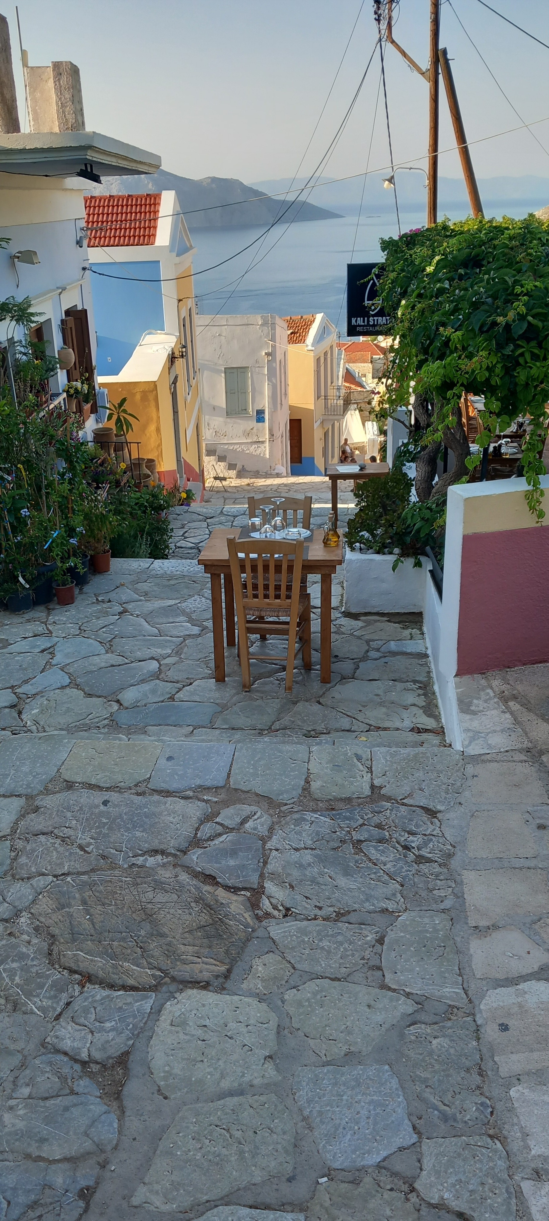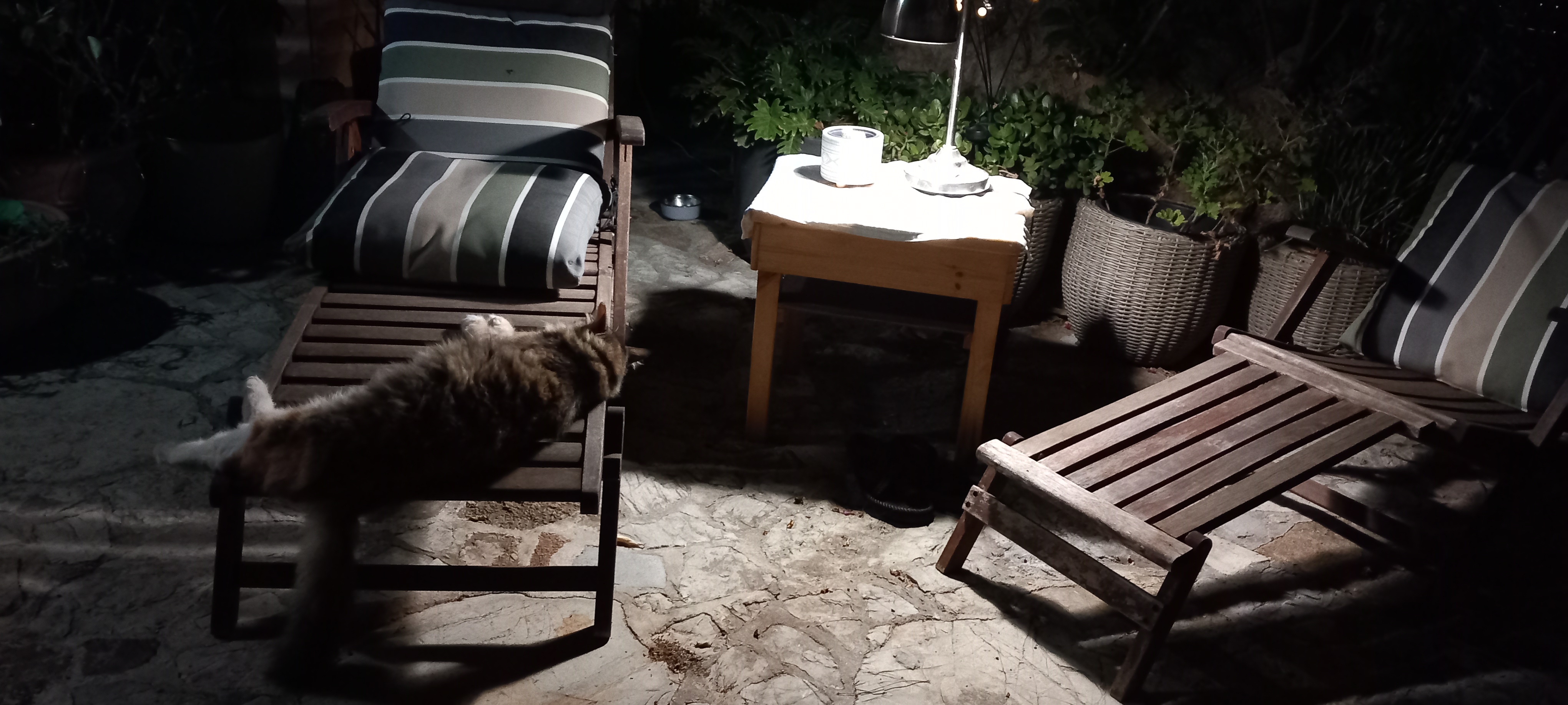 We had a morning ‘down town’ on Saturday which included lunch at To Spitiko, and a humorous taxi ride back up with Constantinos. ‘Where to?’ ‘Japan.’ ‘Okay. Why not Botswana?’ ‘Okay.’ And so on. Harry came to run through his concert pieces in the afternoon, which he did well (in readiness for playing for his dad for the first time later today), and we had our obligatory balcony chat while watching the boats and mulling over the meaning of life. Later in the day, George, Mother and I went to Jenine’s house for a courtyard evening which involved pizza, wine, chat, laughs, and cats.
