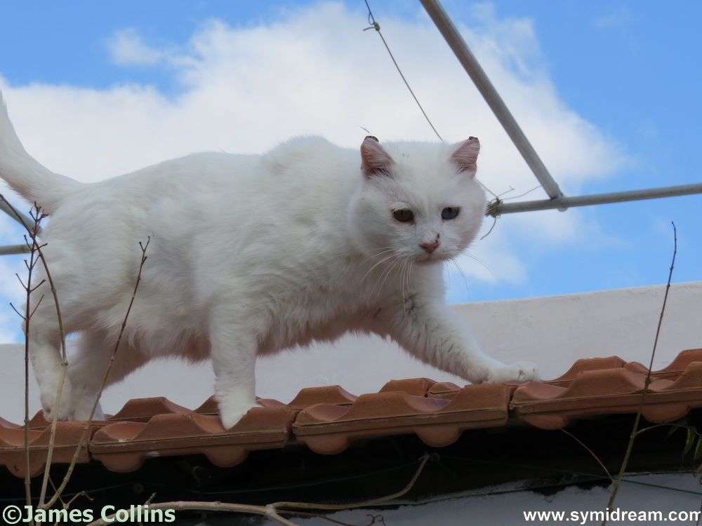 I went up the spiral staircase to the flat roof which in itself caused great disapproval from the cat who was considering another spot right at the top of the stairs (in the most unhelpful place of course, as he’s a cat). Standing carefully on the step-frame I was able to access the storeroom where our landlord keeps all sorts of useful objects, mainly lengths of ‘things’ and boxes of ‘stuff’, paint that is now solid, that kind of thing. I moved a box, put it carefully on the floor and the kitchen lights below went out – causing a roar from Neil who was cooking. Chefs to the left, cats to the right… I found the back of a knackered old chair that will do for now and it comes with the added attraction of being padded.
