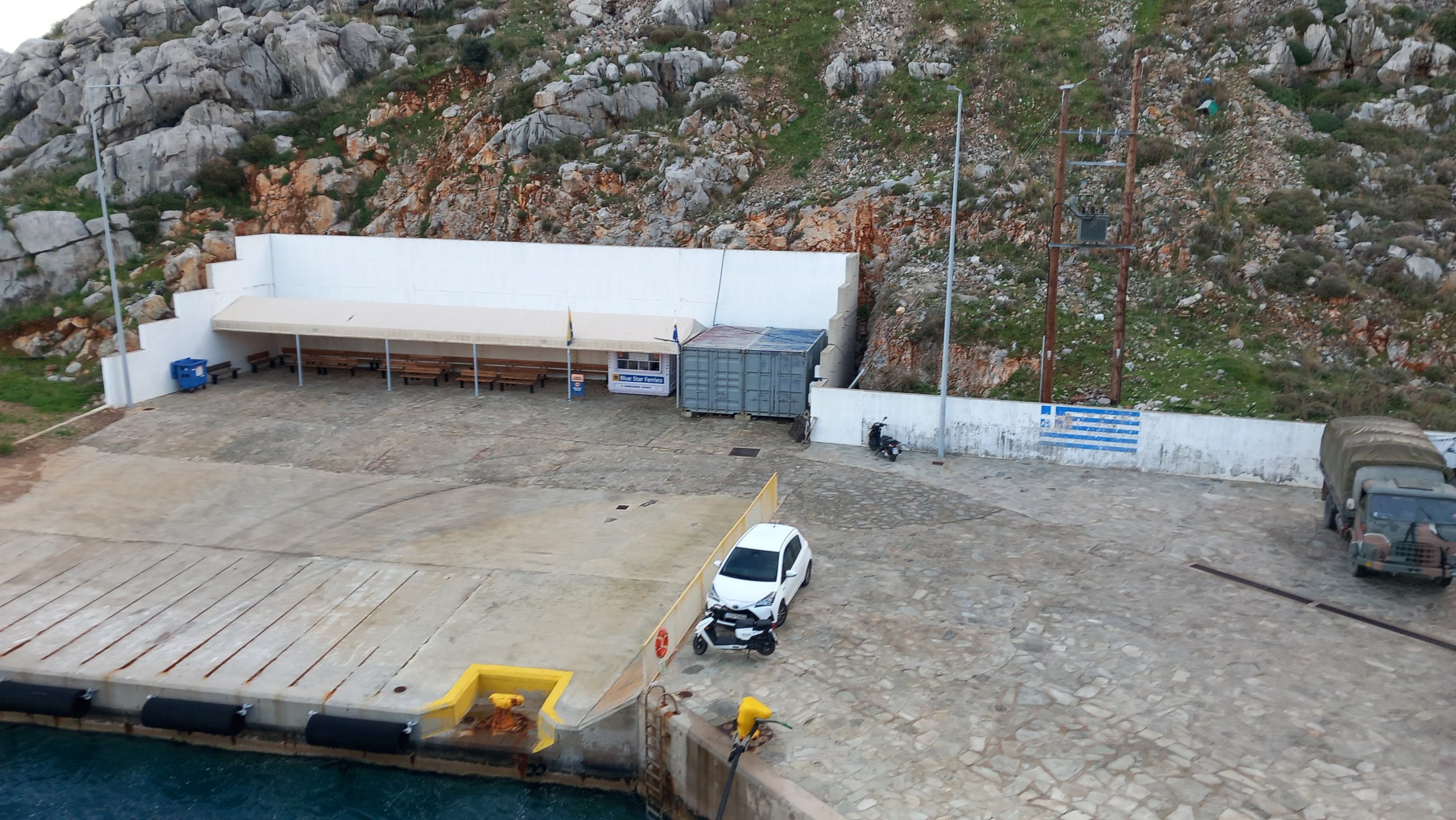 (That white box beside the grey boxes is the new ticket office for Blue Star Ferries – it’s moved from the cafe to there.)
