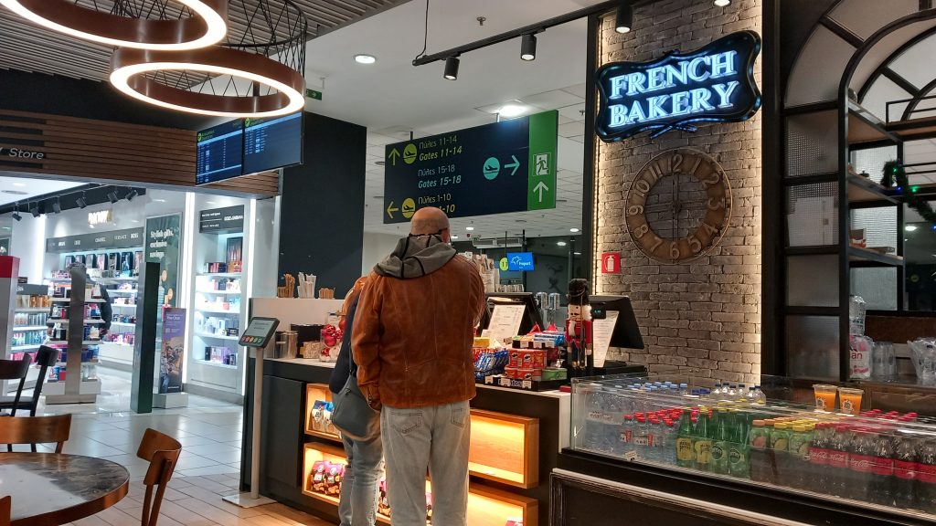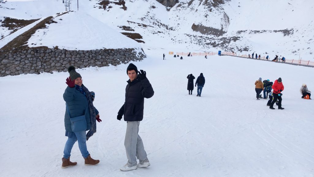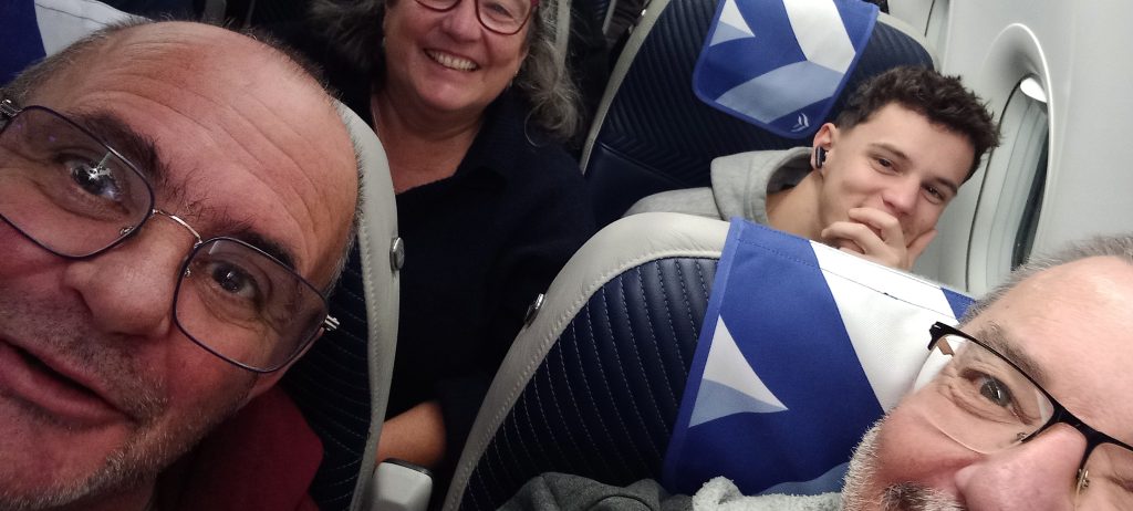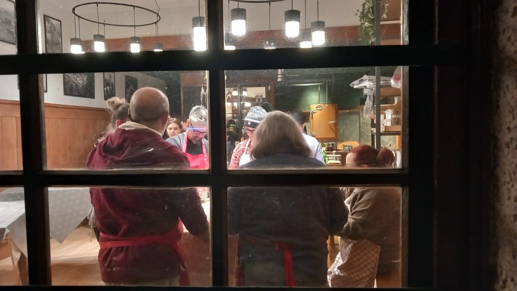 A long hallway full of cupboards, and a double bedroom with a bathroom opposite. (Heated towel rails – I’ve just ordered a small one for home.) Then, we come to a dining/sitting room with a table large enough for eight, a large TV, a fully-equipped kitchen, including baffling coffee machine and dishwasher, a sofa bed made up for our fifth member who couldn’t make the trip, and plenty of heating. Then, a second wing with a huge bedroom and en suite bathroom, and all kitted out in a modern, elegant way. We could want for nothing in this place, and we soon made ourselves at home. It became Christmasy when Jenine blew up an 18” inflatable Christmas tree from Temu and plonked it on a random table.