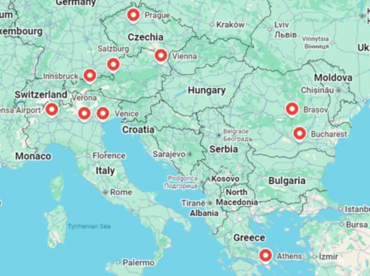 Then what follows is an overnight journey from Prague to Brașov in Romania. There was not time or money enough to stop in Vienna, Budapest or anywhere else en route, but we do have four hours in Vienna, and I might race Harry up to take a photo of the Belvedere while the others are shopping for supplies for the onward, overnight part of the journey, where there is no buffet car, apparently.