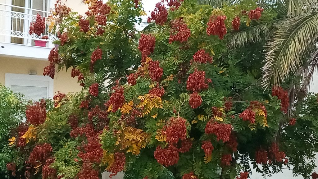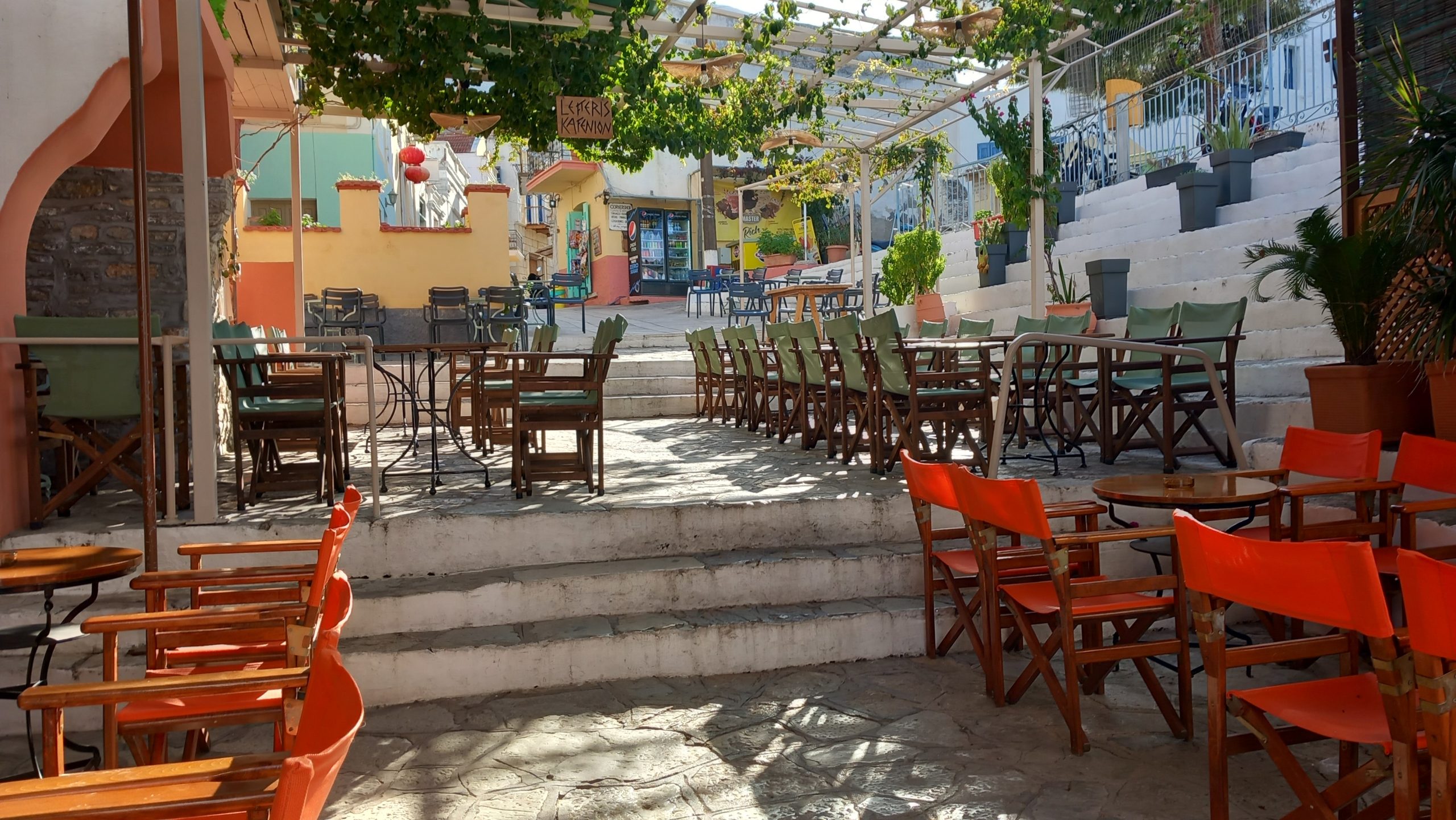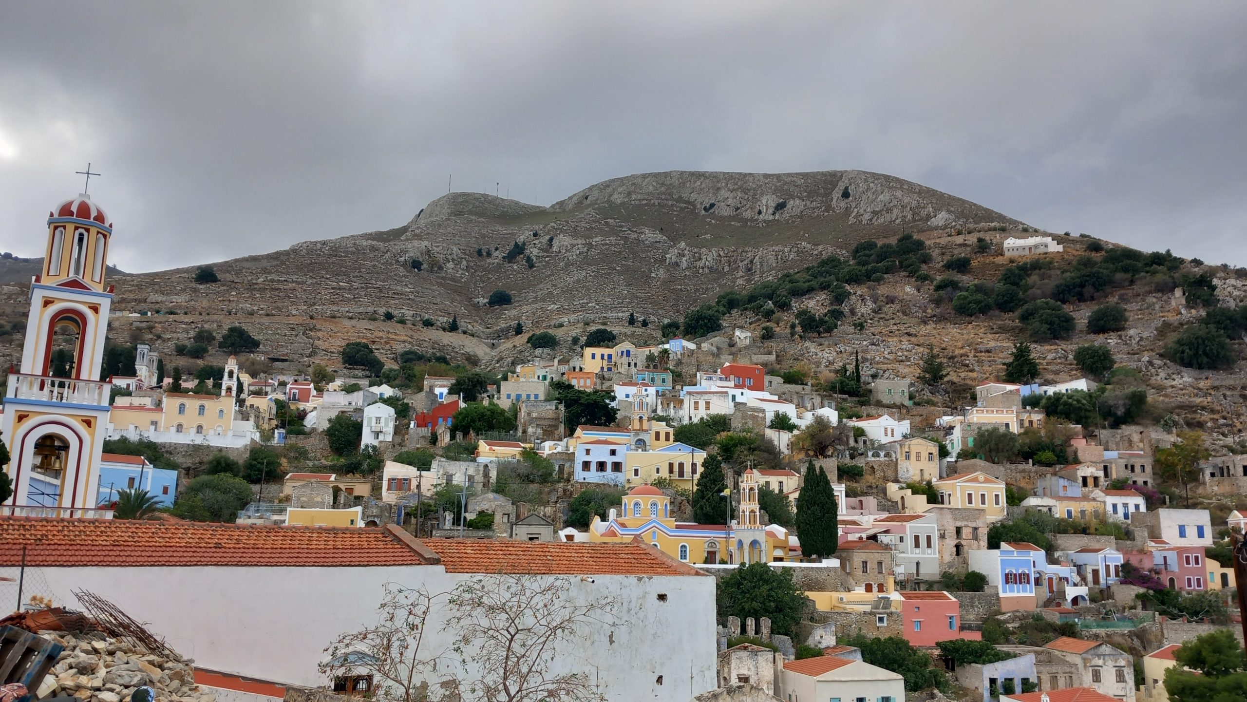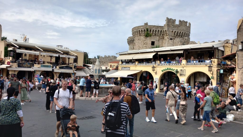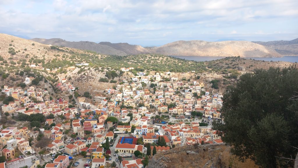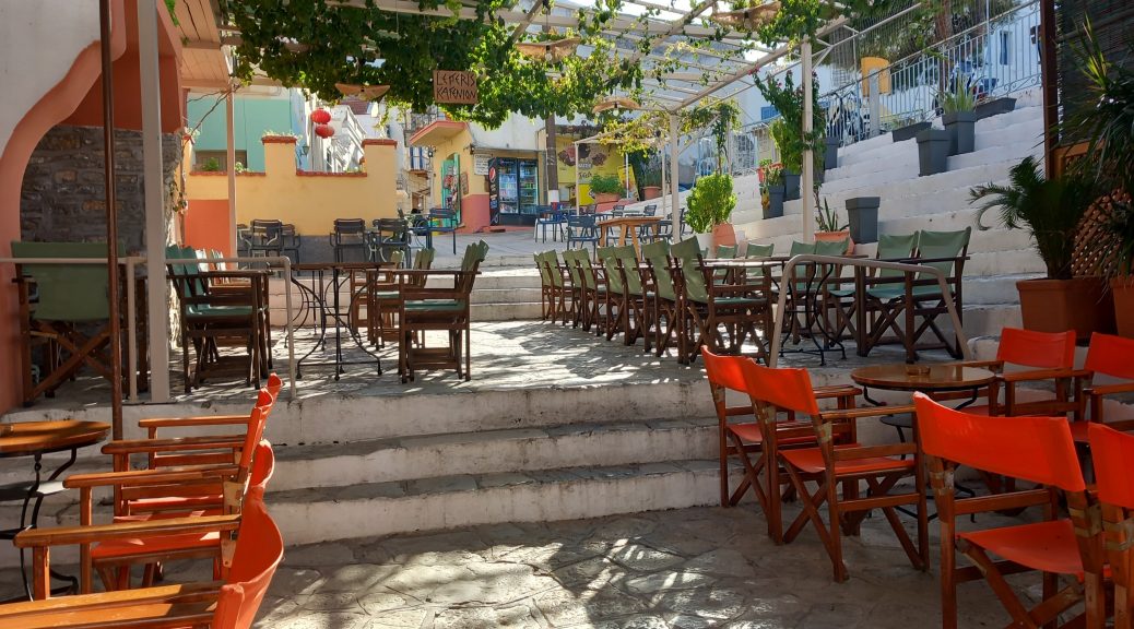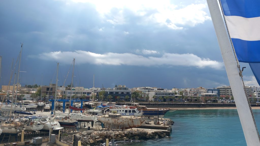 That was as I was about to leave Rhodes, which was, at that time, under a heavy, dark cloud. I don’t think it rained, though. It’s all very quiet here now. I say that, but yesterday, I popped down to the bar in the afternoon and managed to grab more or less the last seat. Then, more people arrived, and I had to help Neil put out more tables and chairs. Maybe because today is Oxi Day, a national holiday, and people have come over for a couple of days to see the parade later this morning. Maybe it was the extended family who were visiting for a night or two, I don’t know, but late afternoon in the square was busy – and there are still day boats coming across from Rhodes.