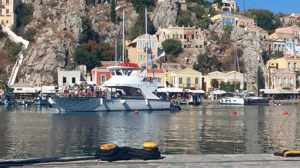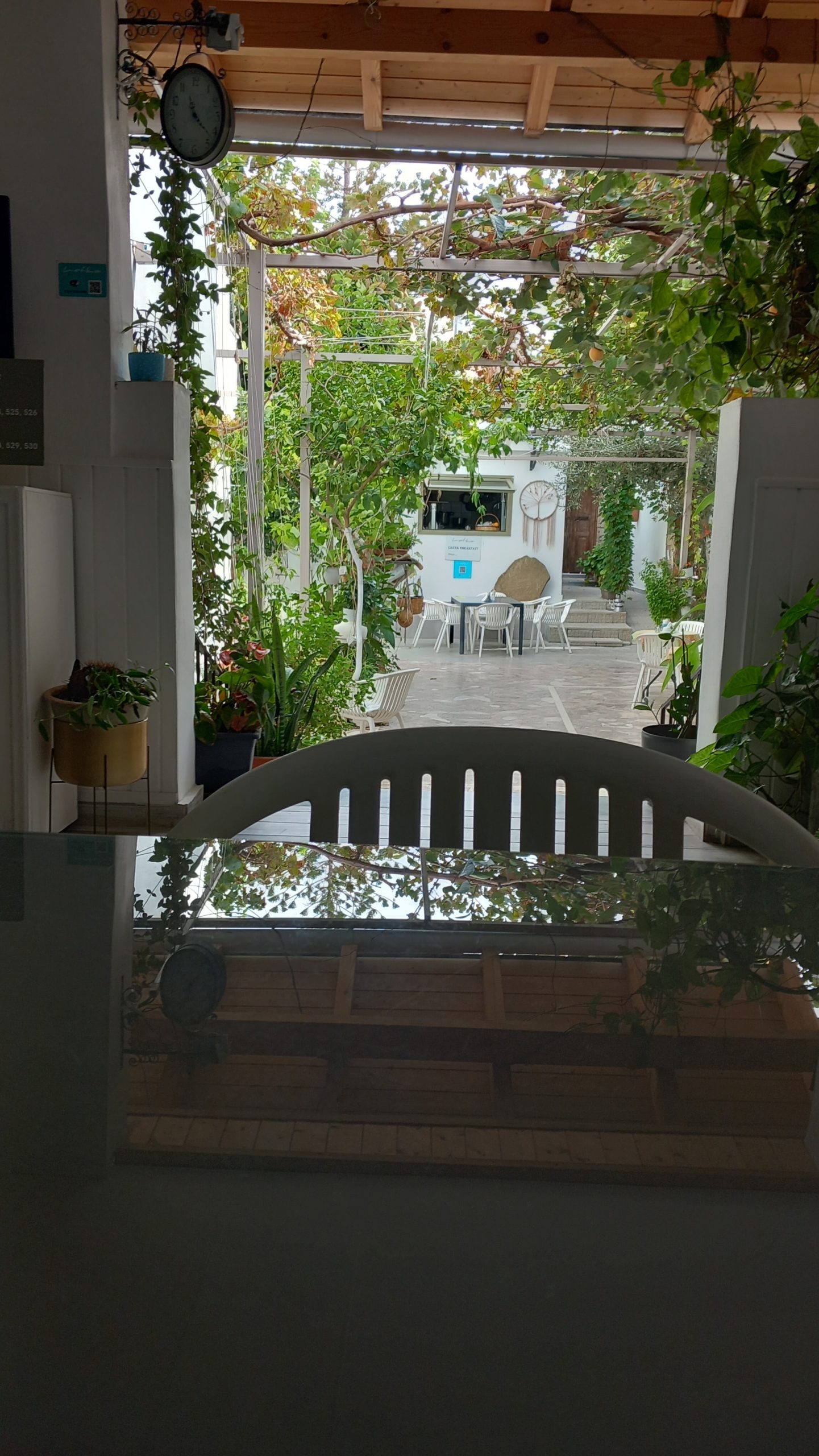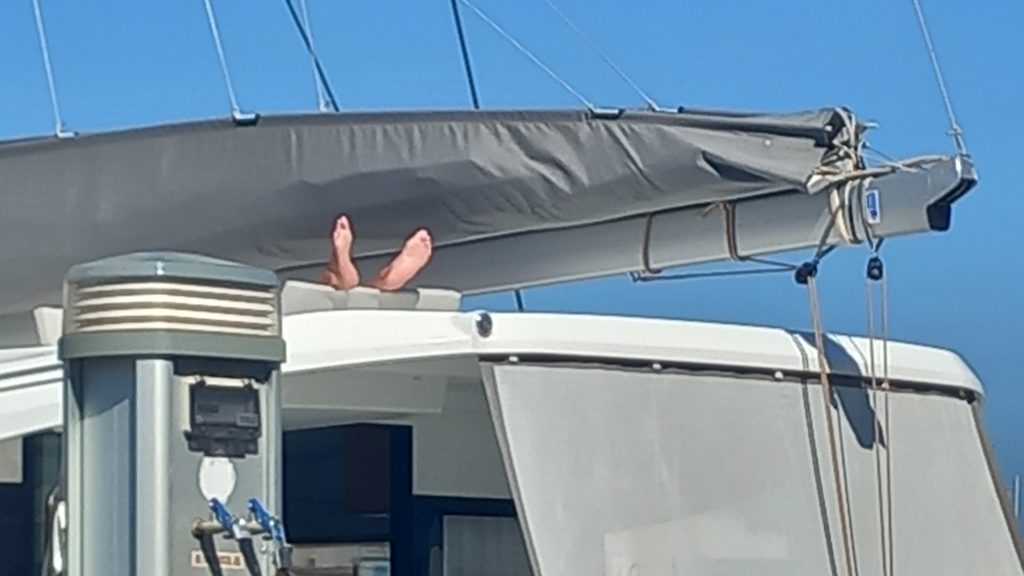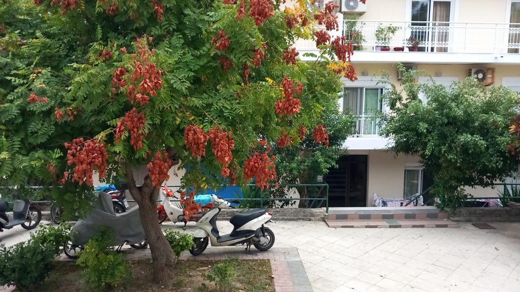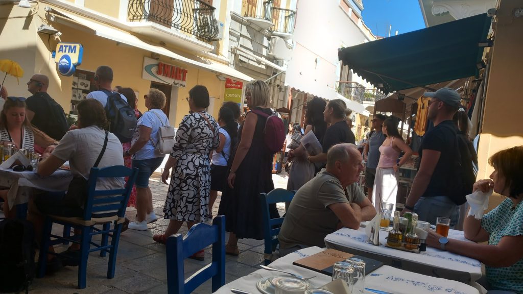 Then, there’s the checking out. Card or cash? Phone, of course. Do you have a loyalty card? ‘Do I?’ I doubt it. ‘Next time.’ Do you want a bag? ‘Yes, please, four.’ (Note: a decision of his own making.) Here’s a thing we pondered. Having collected veg and fruit in individual bags, and bought bread in plastic wrappers, milk in a plastic carton, and cheese that’s been put through a laminator, we’re then charged for plastic bags? To add insult to injury, we have to pack the bags ourselves. ‘It’s not Sotiris’ place, is it?’ No, and don’t put the eggs at the bottom.