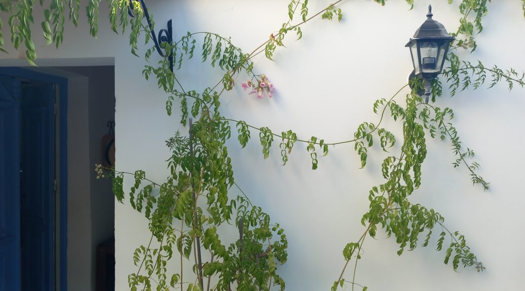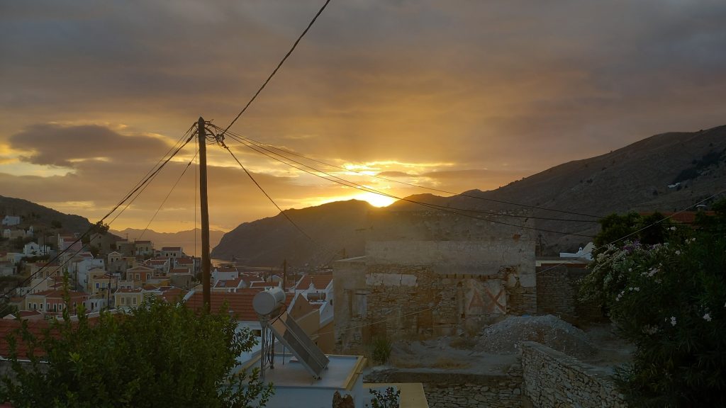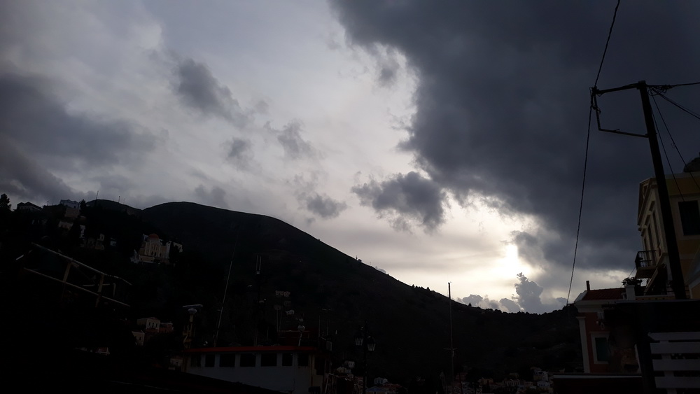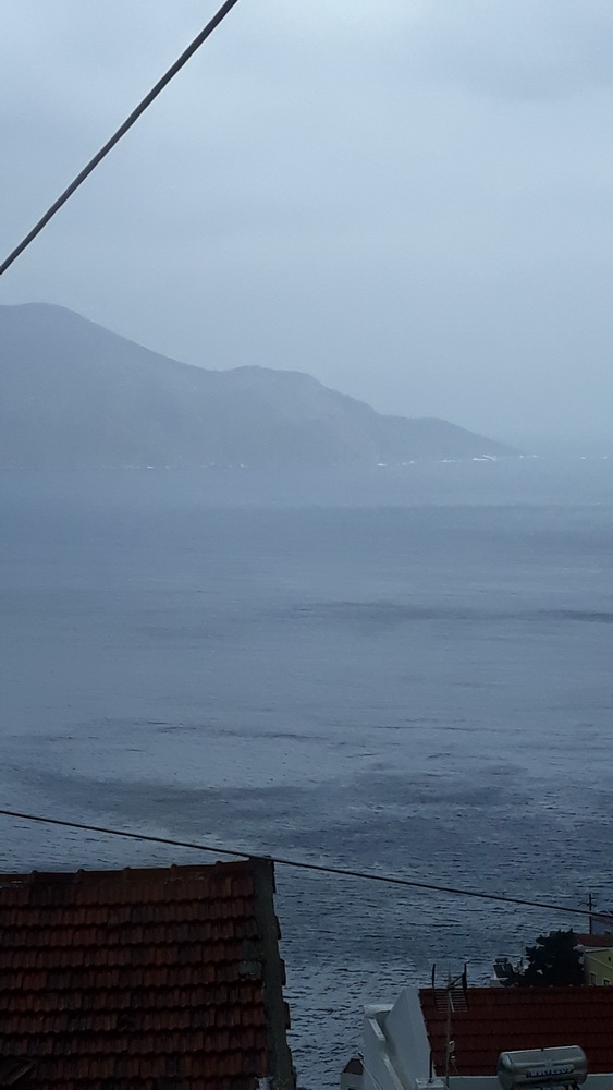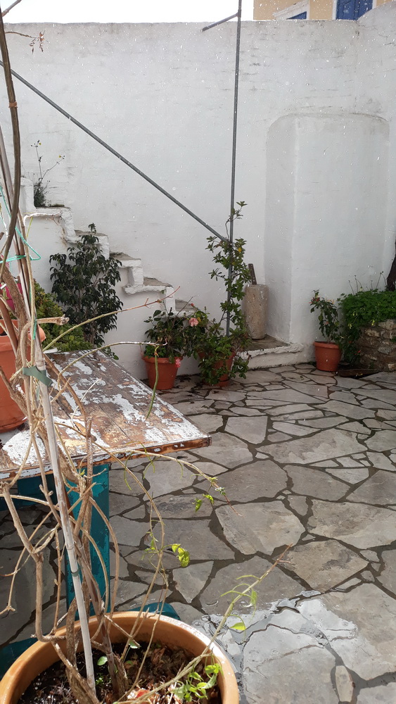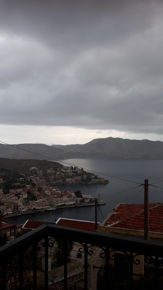 We’ve had a fabulously wet couple of days, the plants are thriving, the courtyard is a mess of fallen leaves and some flowers, and will be swept when dry, and Neil is traipsing down to Yialos this morning to get me some tablets and collect something from ACS while I battle on with the next story. The square and village were fairly busy yesterday afternoon and early evening, which is good to see, and there are still several day trip boats coming in every day, so the season’s not done yet.