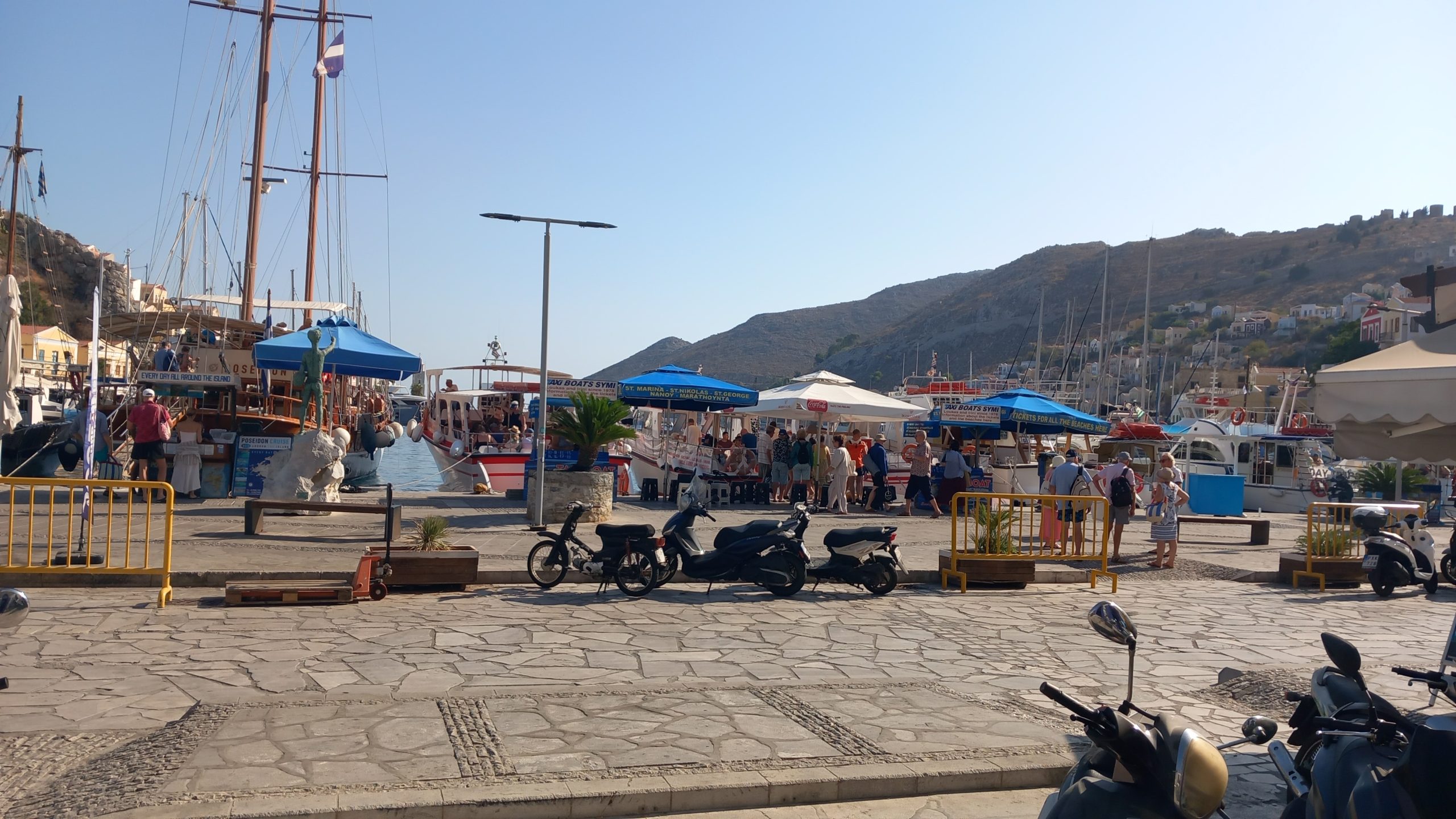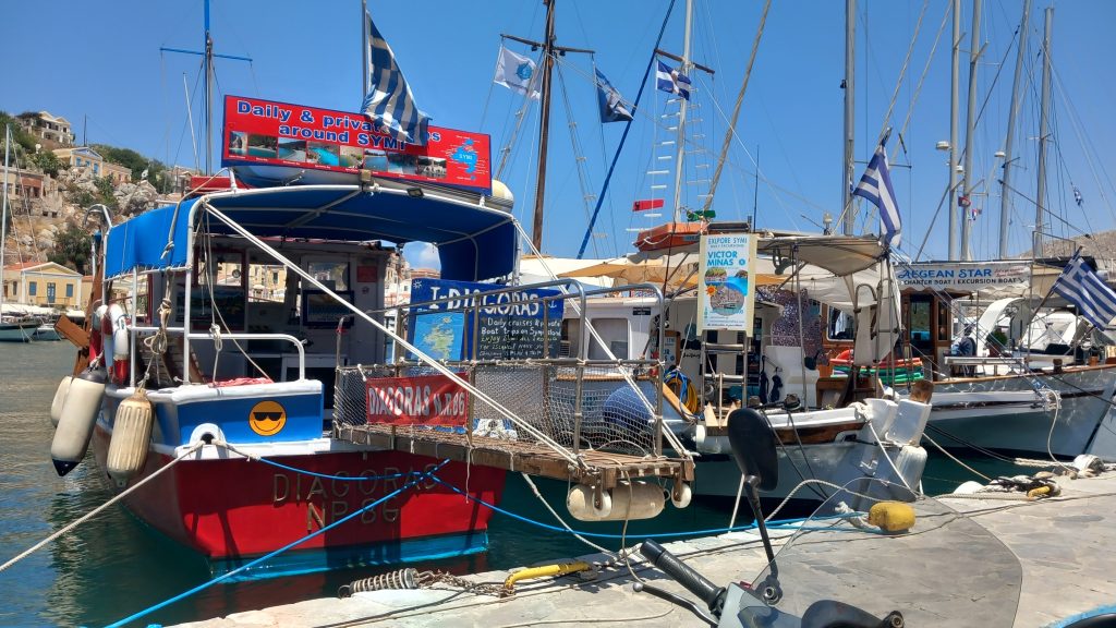 Then we have the day boats and the private hires, plus the private excursion boats. You find them lined up along the quay in Yialos with their advertising boards. That’s also where you find the taxi boats.