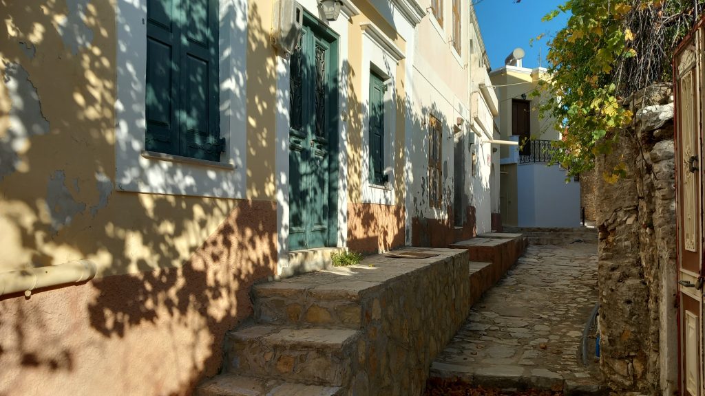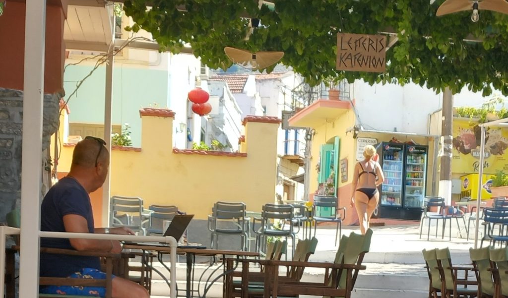 You’ll need a lie down after all that, and on most beaches on Symi, you can do just that. How much you will pay, whether you will be on one of the new tier-and-tariff systems, paying X amount for a back row, or taking out a mortgage for the front row, or packed somewhere mid-stalls with no privacy or view, well… that depends on the beach. Whether you get your own personal torture device for free as long as you spend X amount in the café bar or restaurant depends on where you are. Whether you get a bamboo shade that leaves you with a burlap tan, or a collapsible umbrella (the use of which is the subject of an optional instruction manual), or whether you have one of those ‘set-in-a-concrete block and don’t you dare move it’ affairs, all depends on where you are.