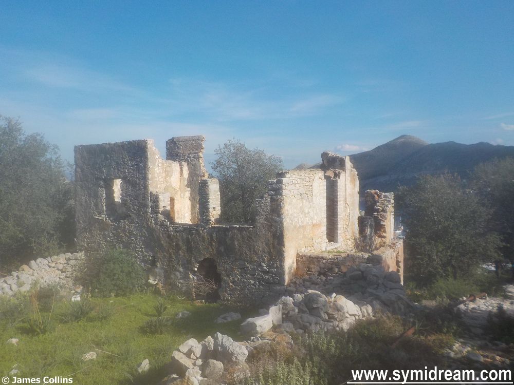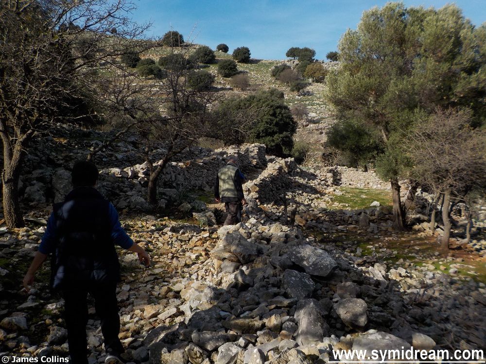 The path becomes rocky and rubbly and then, just before it joins the road where it turns down towards Roukouniotis, you turn right and head down a partially built concrete road towards some houses. And from there it’s a case of following the zigzag donkey track, the old ‘calderimi’ as it winds down to eventually come out at the back of Yialos, behind the Grace Hotel and studios.