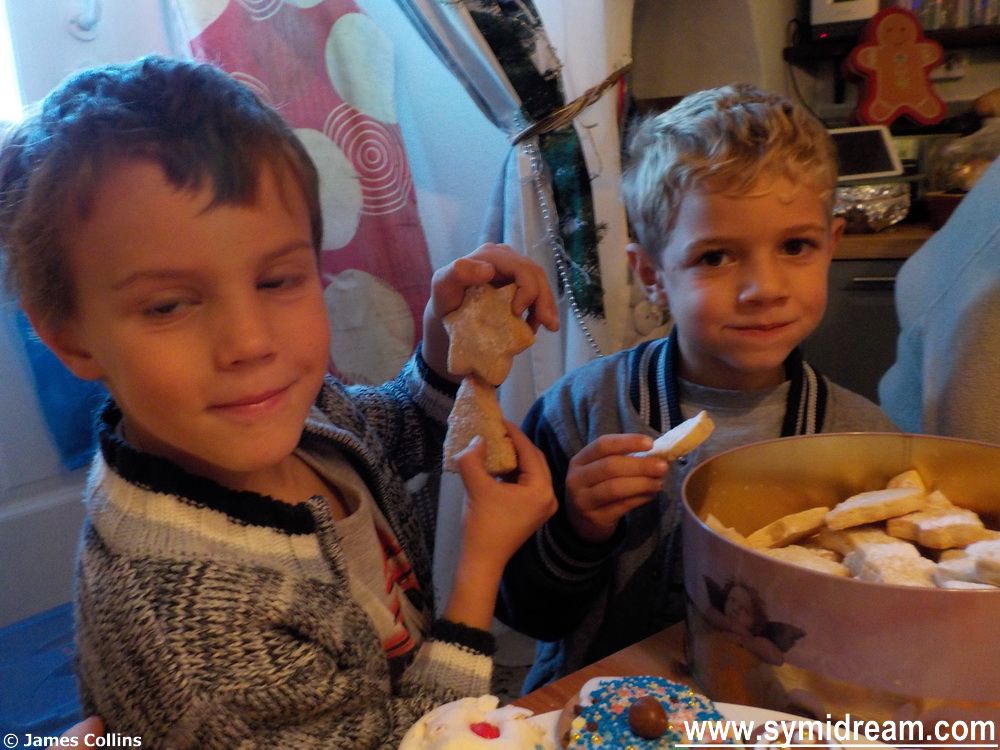 There were many other groups of children out and about too, with triangles to accompany the singing. You walk past shops and hear the sounds from inside and it did put a smile on my lips to hear some of the, um, ‘less enthusiastic’ members of the small choirs – a quick, embarrassed, mumble, a clang on the triangle and a hand held out for some coins. Sam and his mates came to our house and went out and about and made a few euros each, and Harry and his chums went around the village too, a little way. So the Christmas Eve traditions were kept up.