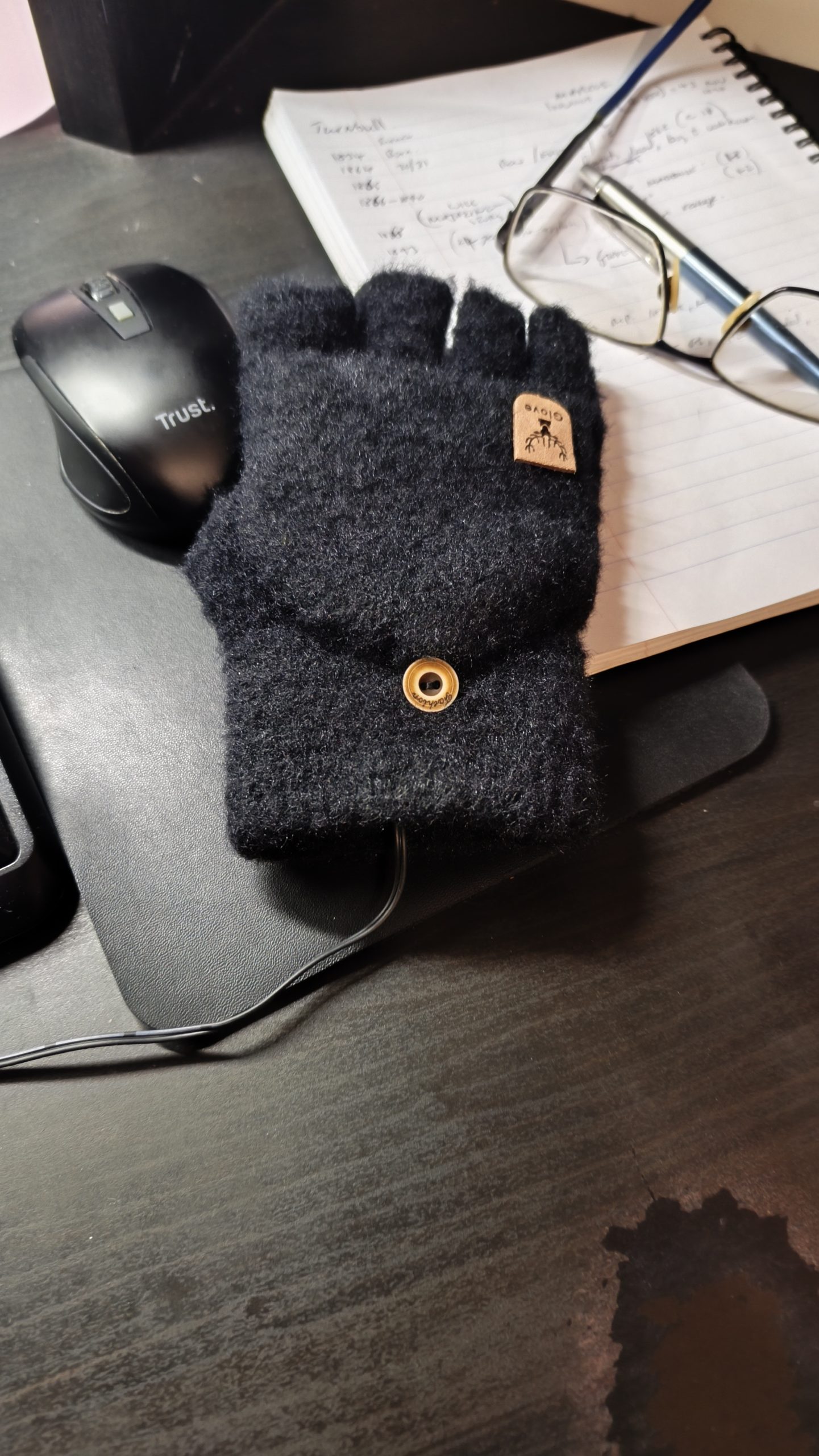 It’s a morning for the self-warming, USB-plug-in fingerless gloves that can become mittens. It’s a cold one this morning, with a slight breeze and a cold blue sky. No doubt it will be warm in the sun later, but for now, I’m straight from my bed to my desk, by way of the tea urn, and on with the gloves. They should start to warm my hands soon, and thus, my fingers. In the meantime, the wires and connections are clunking around beneath my wrists, and I’m typing more clumsily than usual with my random striking of keys, but otherwise, the page still looks like a red-underline mess.