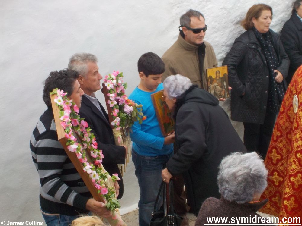 We finally arrive, one hour and forty minutes after leaving home, and head up to the terraces to be suitably out of the way but still part of the event. Met and greeted by many people we know from the village, a great big welcome from Katerina who hosts the event (and puts a mean seem in your jeans when then need turning up), a thank you from Zoe to my mum for the painting she gave her, hands shaken all round, and then there’s time to listen to the chanting and watch the procession of the icon.