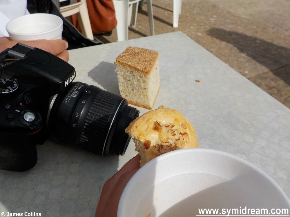 And then it’s time for the real social stuff to start. Warm Greek coffee, with milk and sugar, ‘sketo’ is available as well, biscuits made by Litsa, but which Litsa is anyone’s guess, some of the bread, a cheese pie and a donut, and then everyone who wants one is given a bag and extras to take away for later, or for others who can’t be there. Later, lamb and kritheraki is served for those who want lunch, there’s water and wine, and there’s a bottle of whisky on the go on Alexis and Manolis’ table over there where some great and lengthy debate has started up between the two fisher-friends.