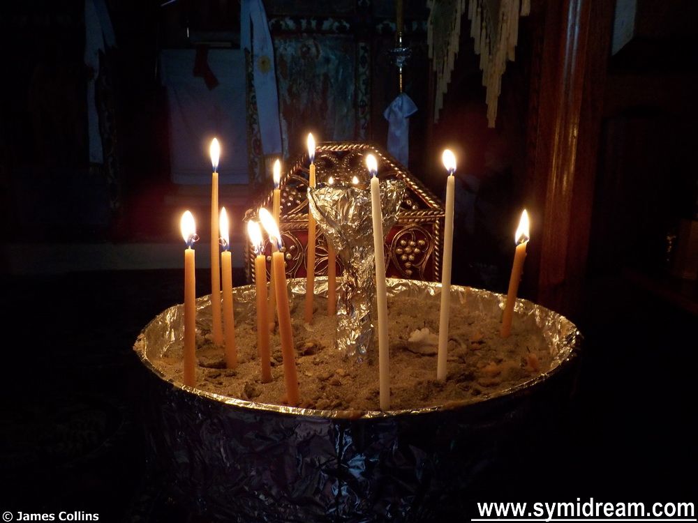 Meanwhile, back at the event. The service finishes with the blessing and sharing of the bread, which here happens outside in the courtyard. The chapel is very small at Kokkimidis, which is why many people stand outside and listen to the service from there. The bread is then passed around, the congregation is blessed and buys candles to light. We light ours later when there is room inside the chapel.