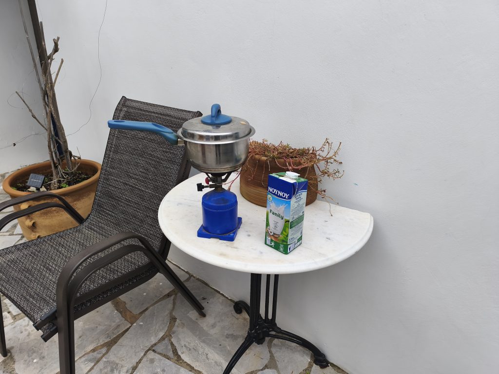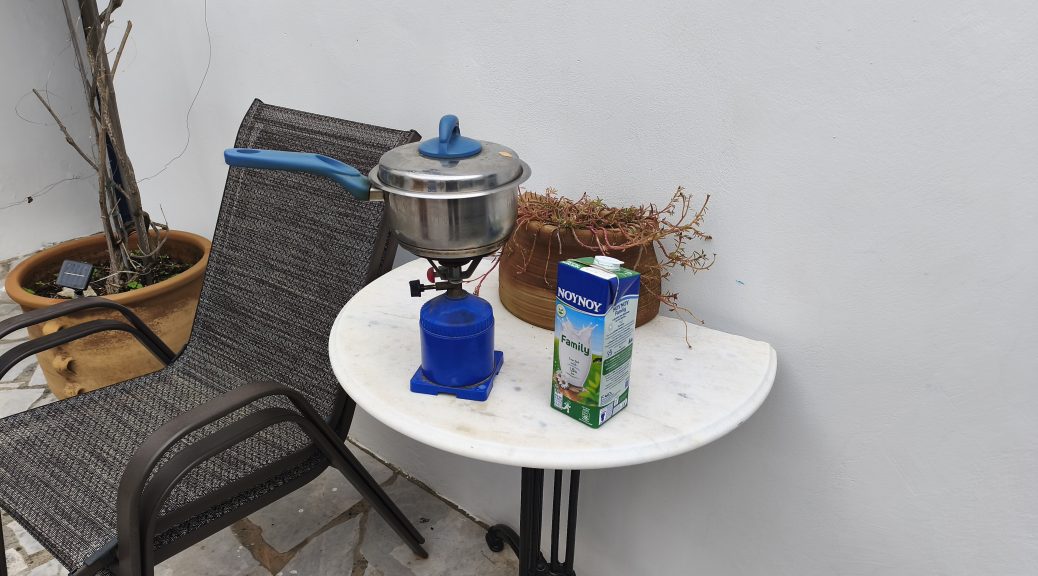 Well, this is rather fine. I’m sitting here on Sunday morning, lit only by the overhead laptop light running from the battery, in an otherwise blacked out room, and Neil is in the courtyard with the camping stove, a saucepan and tea bags. There is no sound but the hiss of the gas and the thudding of my fingers.