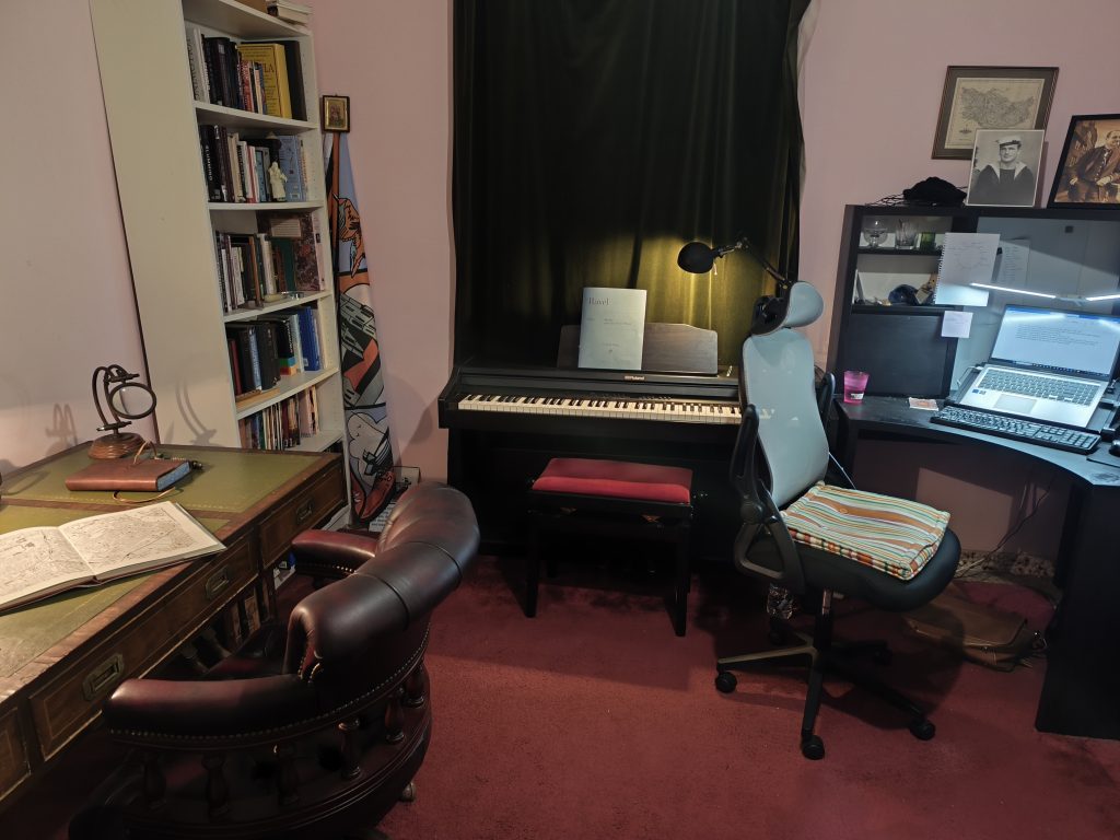 I put up a photo of my writing desk yesterday, and here’s another of the room since we moved the piano in here. I have cut off the top of the curtains (in the shot) because I am still waiting for the right hooks, and at the moment, it looks like something from the set of Phantom, only with less swag. Have a good day.