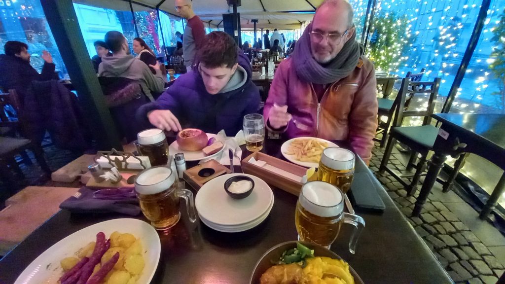 Another reason for staying there happens when we arrive (and this may not always apply, because it’s not actually in the rule book). It’s a quarter to ten by now, and we’re all a little bedraggled and in need of a tea, or a café Fuddo, or whatever. Seeing this, the receptionist hands us the forms to fill in and suggests we do it over breakfast before the dining room closes. In giving us our multi-pass wrist bands, she’s in effect giving us an extra breakfast and two lunches each – had we been staying until the next afternoon. As it happens, our price includes four full meals each, plus whatever we later drain from the bar. As the cost of such enthusiastic extravagance out in town could easily exceed €200, we’ve got a good deal, and we’re not complaining. Mind you, Harry had his own home to go to and stay at, but not until he’d also been invited to a free breakfast care of the hotel.