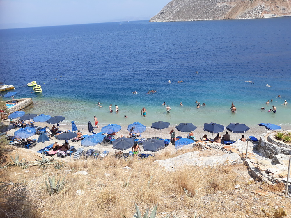 As I was saying yesterday, we tend to take the coast road back from Nimborio to Yialos, so we have a chance to look at the sea and the coves on the way around. There’s not very much shade, although there are now seats (concrete) to rest on and some are under the few trees. It is possible, at certain times of the day, to catch the train back as it runs nearly to Nimborio, but now it has only one carriage, you might find it full, so I wouldn’t rely on it.