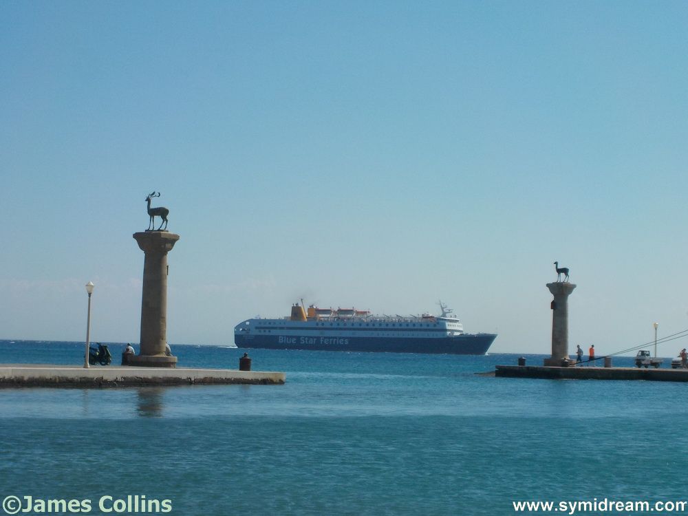 There were other interesting things happening in Rhodes: Saffron for a curry with friends on the Tuesday, no need to book at the Lydia – a good room at a low price, holiday makers starting to appear, a bit windy on the coast so the sunbathers were around the other side of the bay, people were swimming and diving and I caught a glimpse of the Blue Star coming over and snapped it just between the famous deer of Rhodes at Mandraki.
