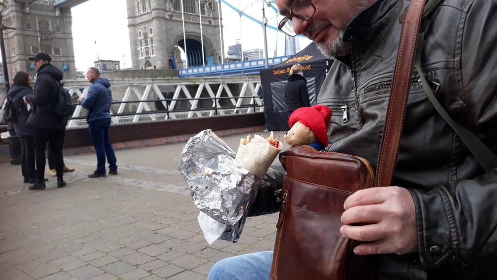 By then, we were hankering for a kebab. No offence to the Greek giros, but when you used to live just off the Balls Pond Road, and you’ve not had a decent Turkish kabab for 18 years, and suddenly you can, well, these things must be done. We chatted to the guys at the Greek food stall under Tower Bridge but then had to hide from them as we edged closer to the Turkish stall next door. I have to say, a massive wrap with all the bits and pieces and chilli sauce was more than welcome.