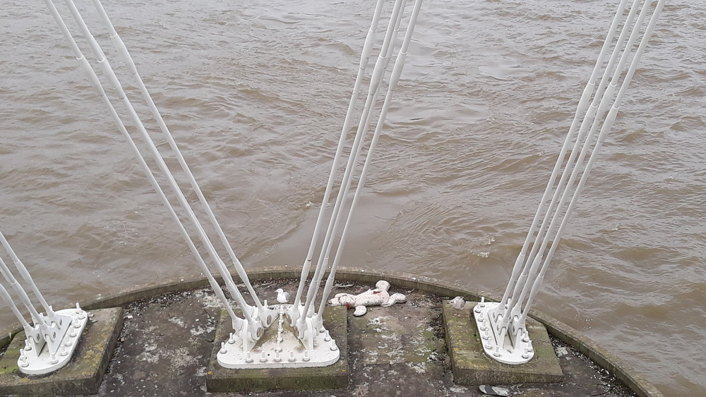 Walking across the bridge, I couldn’t help wonder about suicides, mainly because of this rather tragic stuffed hound who had, it seemed, reached the end of his lead and given himself up to the river only to miss his target. Poor thing.