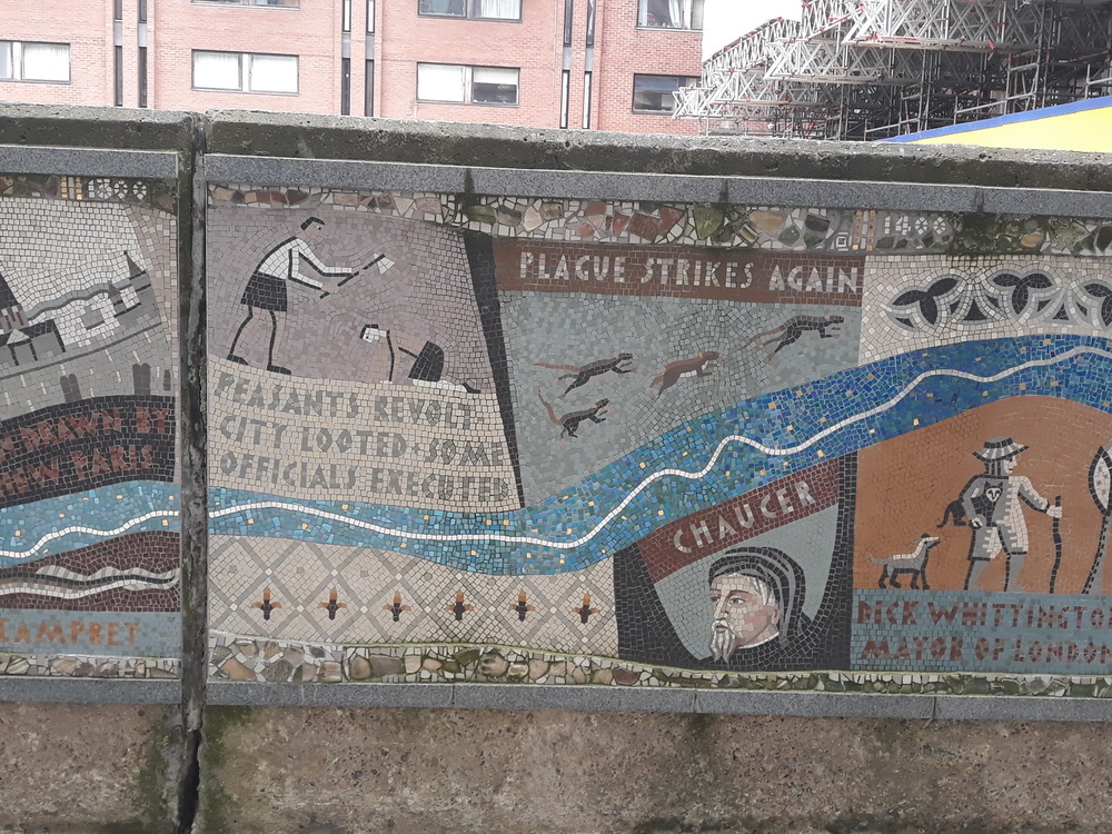 Continuing on, taking a detour around Broken Wharf House and other buildings that block the river path, re-joining the path and wandering on, we came across a mosaic mural that gave the history of London through the ages. This little gem is tucked away, but worth a look as the further you walk, the more up to date it becomes – depending on your direction of travel. We noted with interest that after Dick Whittington, Mayor of London came ‘Plague strikes again’, closely followed by the peasants’ Revolt, and I can’t help wondering if history is now repeating itself. Your PM was once Mayor of London (I inserted a Dick reference there, but took it out) and is now ineffectually dithering with a ‘plague’ and a certain amount of revolt by people he no doubt sees as peasants. If that is the case, take heart, because the section about the revolt states, ‘City looted + some officials executed.’