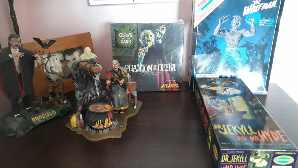 During the day, I spent some time on my writing work, in this case, preparing a blog post about my next project, which you can find here. As the breakfast came with a bottle of Cava, the morning was a little wobbly, but I soon sobered up when lunch came around; bangers and mash. It was accompanied by a bouquet of flowers. Later, in the afternoon, after the homemade birthday cake, I did an online piano lesson with godson #2, and later, a video chat with the family where he played me happy birthday and a tune from Phantom of the Opera. That fitted with the present I had bought myself; a model kit of Jekyll as Hyde, which is now waiting in line with my Wolfman and a second Phantom. (The first is in the sitting room with the Invisible Man.)