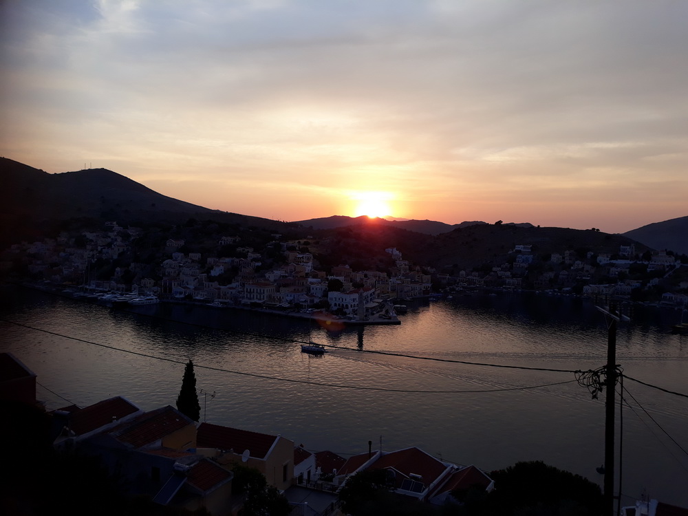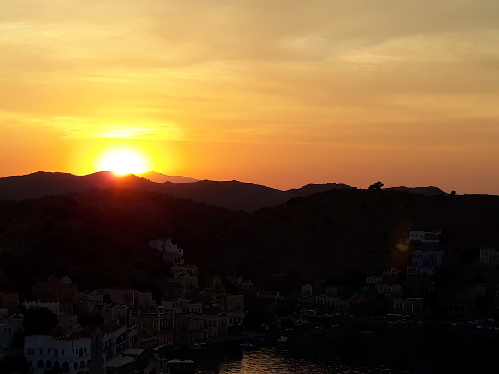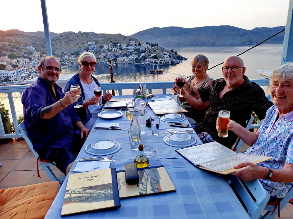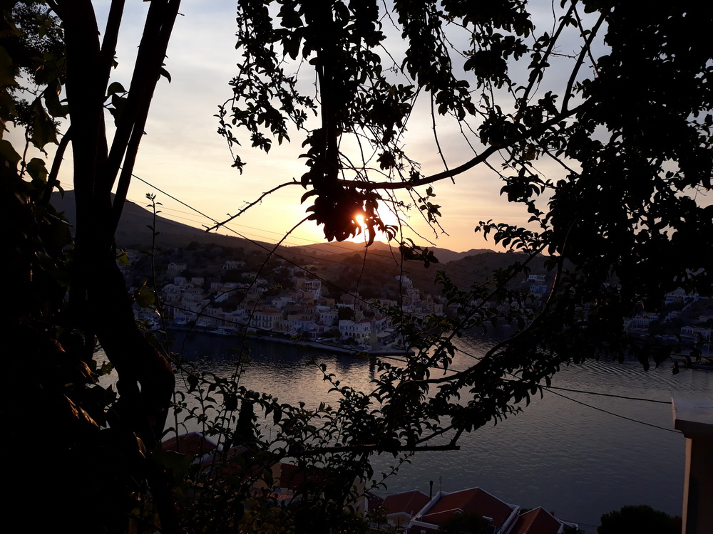It’s not difficult to find this taverna. You can take a taxi from Yialos or walk up, or walk down from the village (take a torch for the way back). Returning from Rhodes on Friday, I walked up from the Blue Star port, passing Haritomeni on the way. Opposite the turning at Petalo (the taverna on the east side of Yialos, the entrance to the new harbour, now with lush seating, plenty of space, swimming and, I am told, great food), there is a cut in the hillside and a road heading up. It’s a bit steep at times but not for long. Follow that up, and you will arrive at Haritomeni. Can’t miss it. From the village, walk down to ‘Kali Strata corner’ where the bar was, and further down to where the high school still is. Cut diagonally right across the carpark and follow that lane. It winds and dips, offers lovely views of the harbour and eventually comes out at the top of the cut/road mentioned above, with the taverna on your right. You can phone for a taxi later, and they will take you wherever you need to go with, perhaps, the exception of Nimborio – check that though, as I heard a couple of the drivers will drive there now.