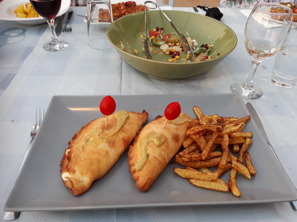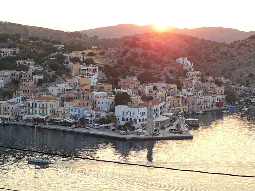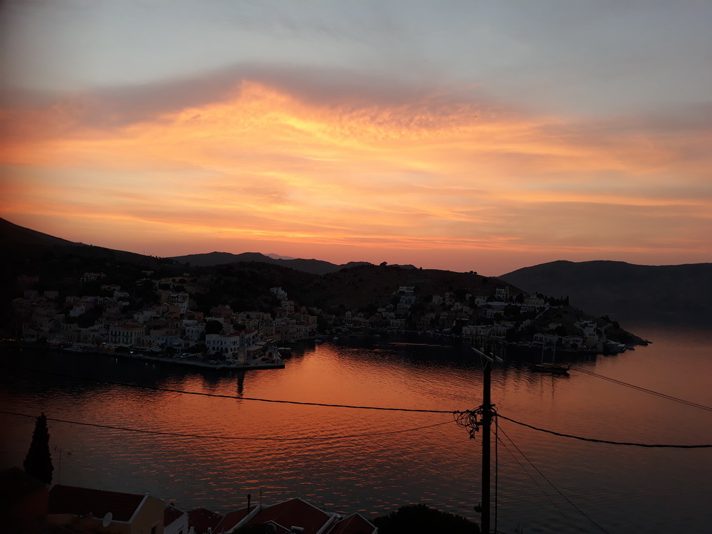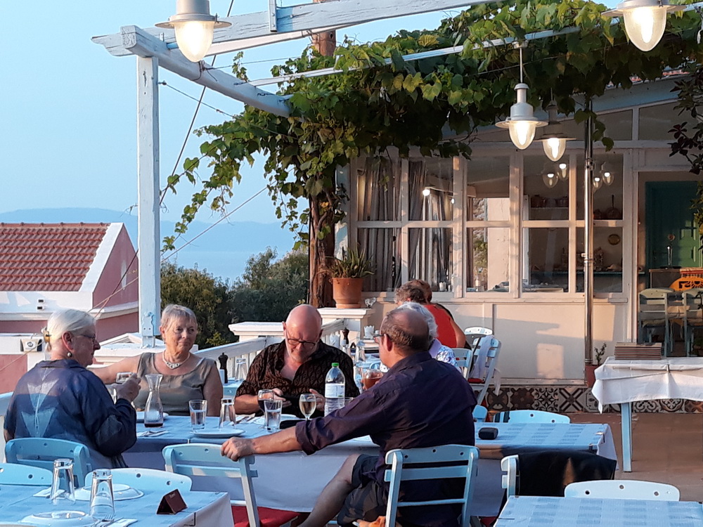 Meanwhile, Saturday night was a treat. We were taken as guests to Haritomeni, the taverna on the hillside at Petini which overlooks the harbour. We arrived early, in plenty of time to see the sunset as you will see from the photos. The menu here is wide-ranging, and there is a specials board which included rabbit, lamb in lemon sauce, veal cheeks and something I had never had before, chicken and yoghurt in pastry. Our party shared a few starters, salads, dips, bread, and a very pleasant house wine while discussing all and sundry, and enjoyed the sunset almost as much as the food. A big thank you to Hillary and supporting cast, it was a treat and a very special evening.