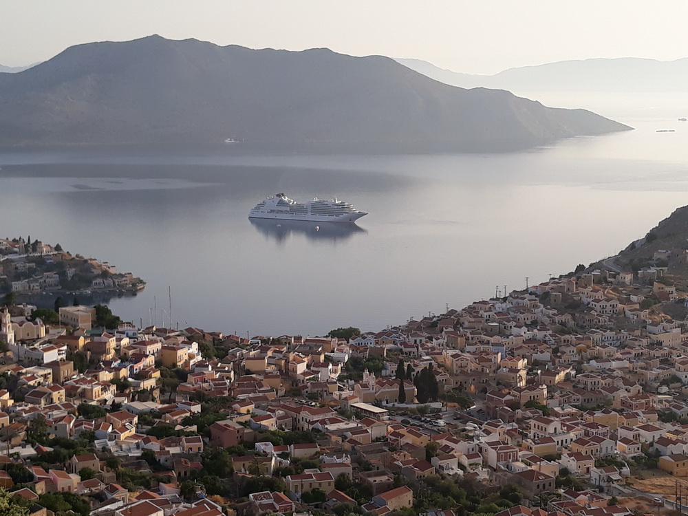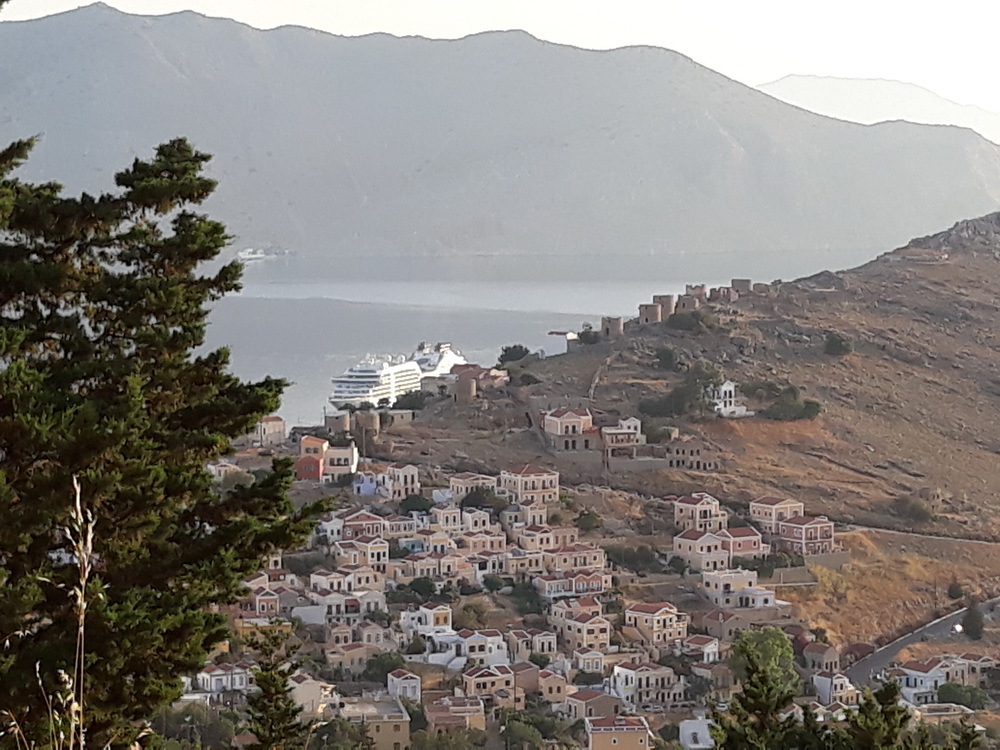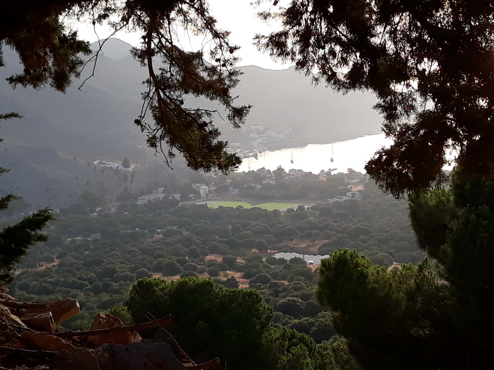 On the way down, there were waves to/from the farmers and workmen heading up, and the gathering of day-workers at Campos whose number varies by the day and time. Through the village for a kali mera to the baker and Nikitas at the kiosk, a pack of water from Maria, just opening the corner shop, and back home. Neil was also out walking, though he went down and then up, taking in Yialos and coming back via the main road.