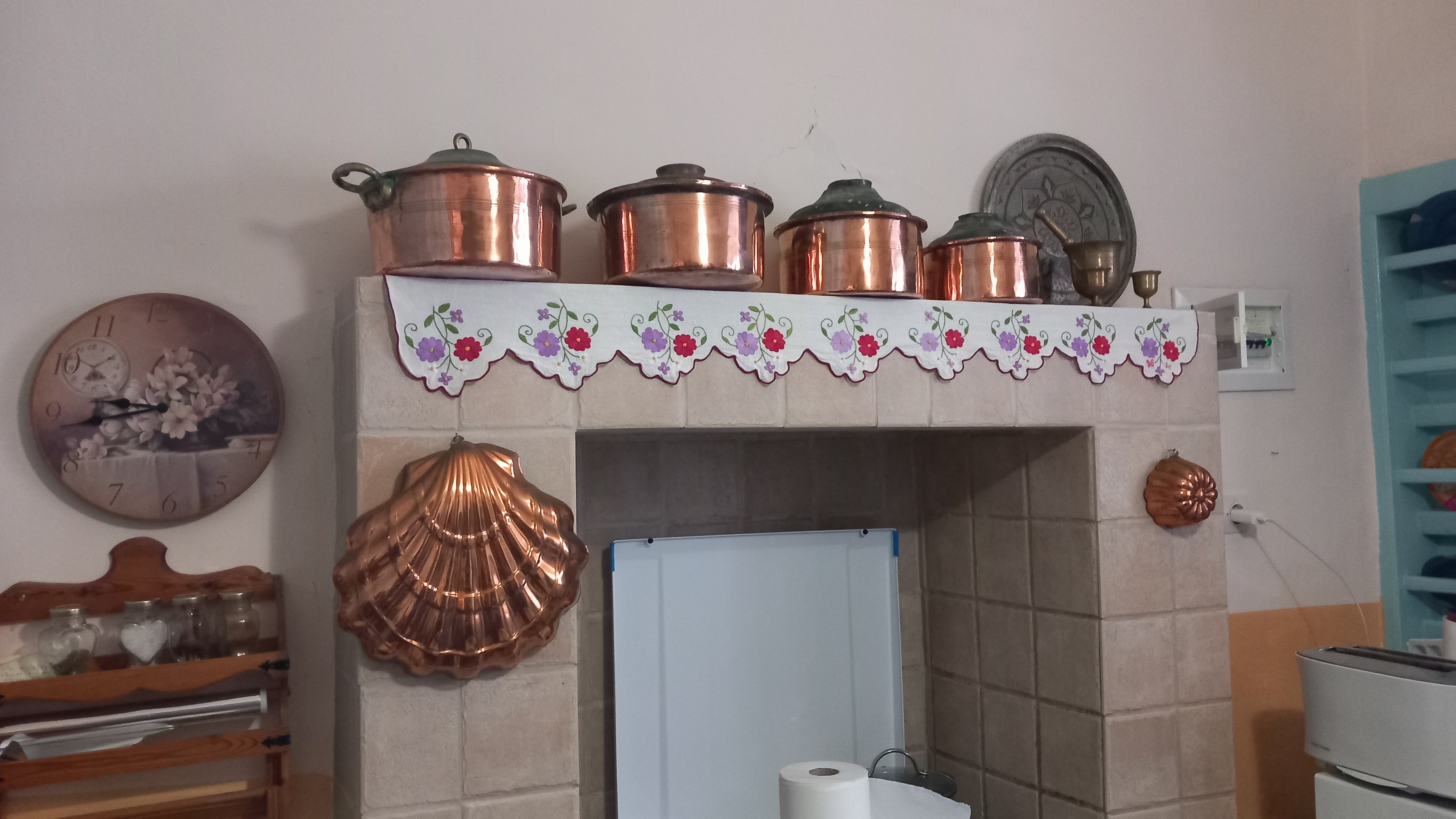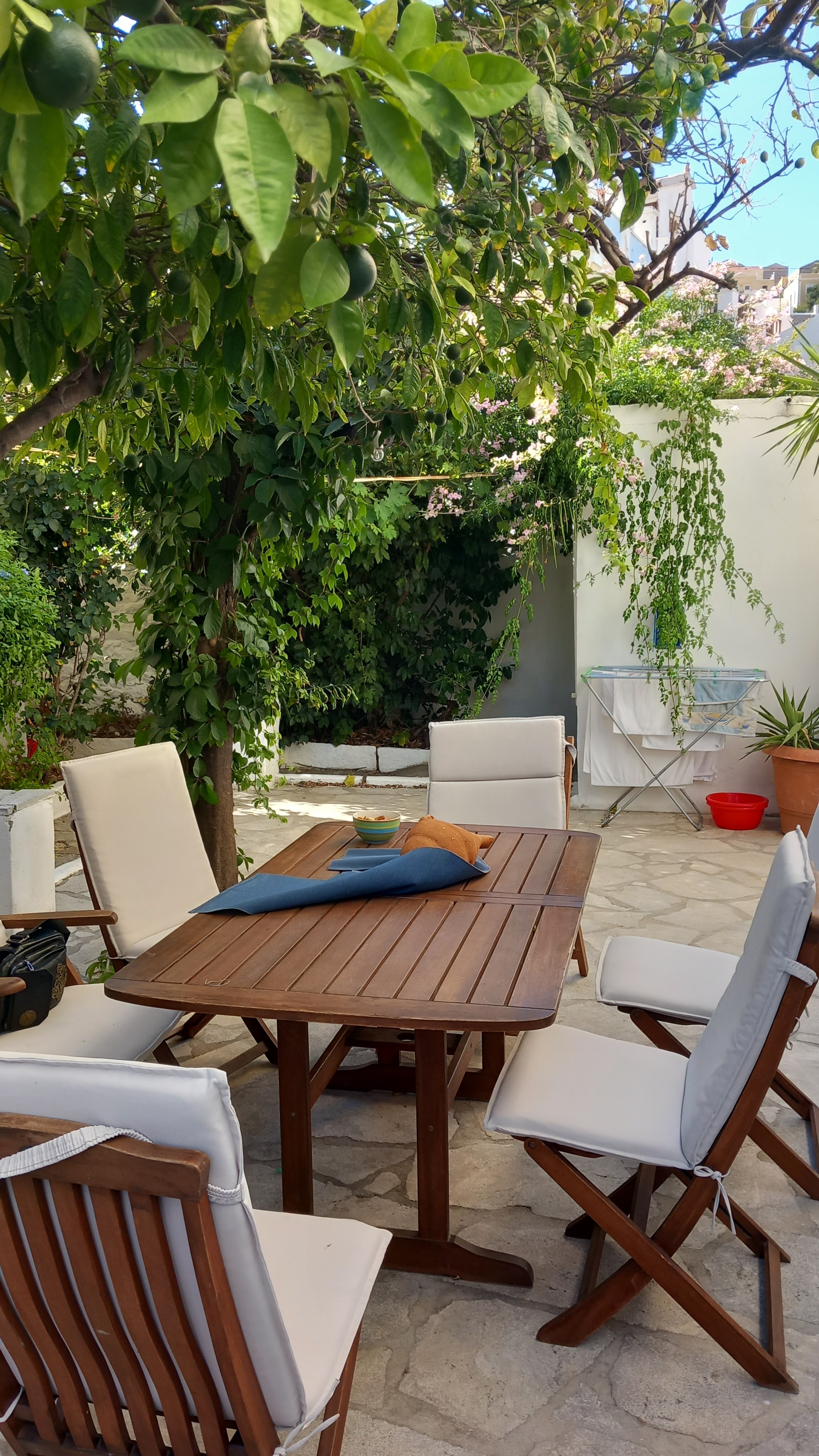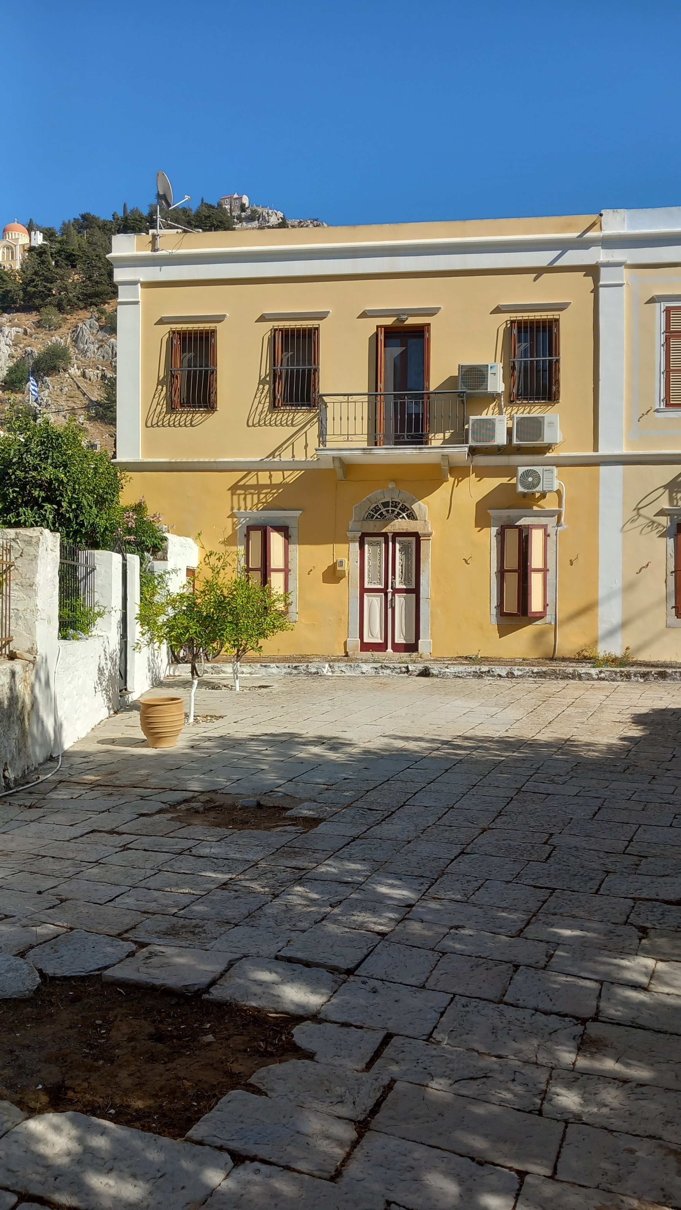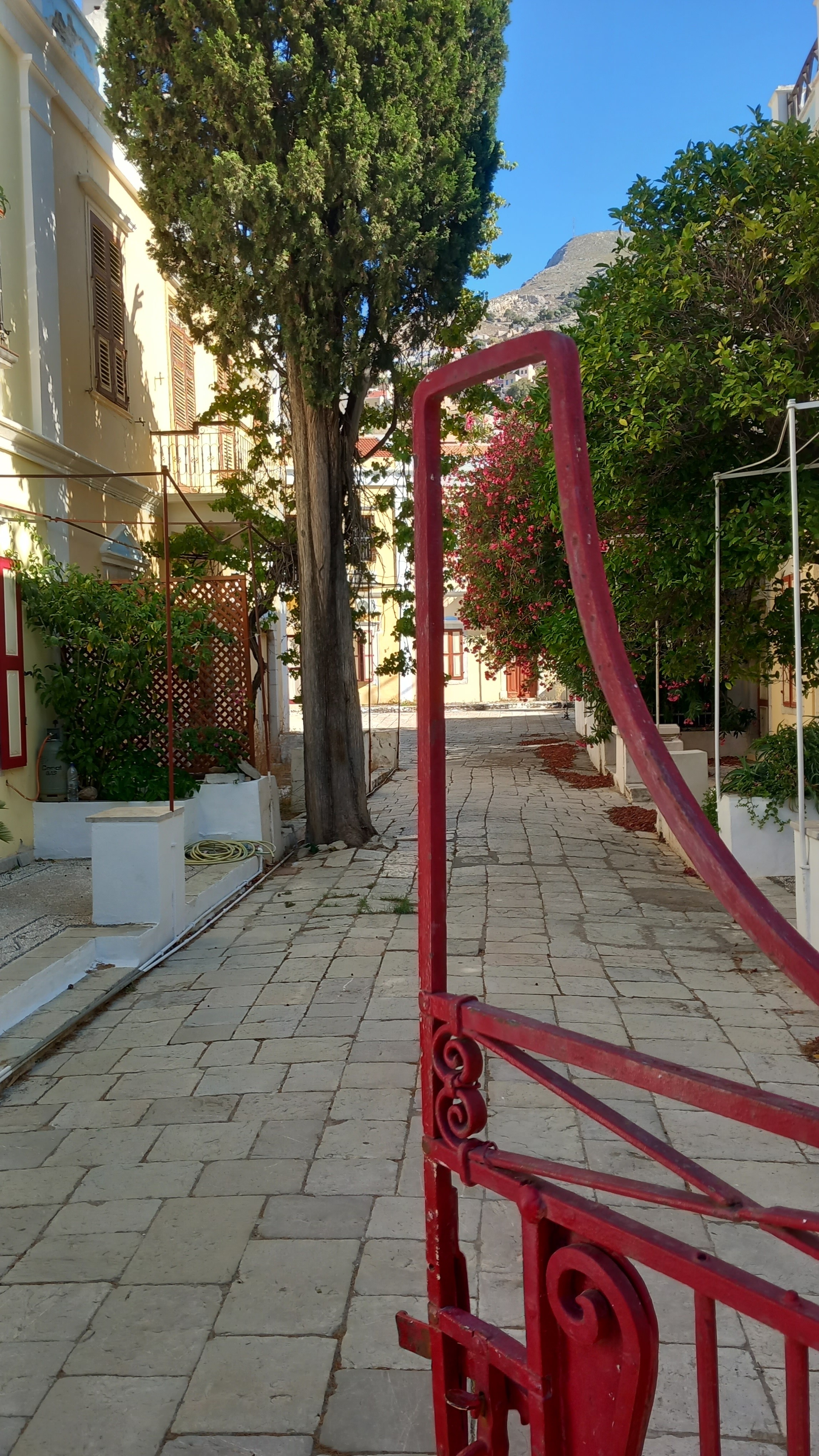 If you’re looking for a traditional stay in a very traditional Symi house, then you could do worse than try this place. It has original furniture and fittings, with bathroom fittings from whenever avocado was a thing. It has the family’s dark wood furniture, even the photos, some of which must be 100 years old, judging by the fashions. There are the copper dowery, pots and pans, above the oven alcove in the kitchen, a great big courtyard at the back opening onto what was the basketball court (now a small tennis court and outside gym for all to use), and it has a quaint outside bathroom. James and his daughter love it, and are pleased to be staying in somewhere with history. I can also tell you, it was very quiet, being away form the main hustle of the port, yet only a minute to get to the harbour front and shops, convenient for your early morning bakery (and hairdresser), children’s playground and other amenities, and was clean and looked after.