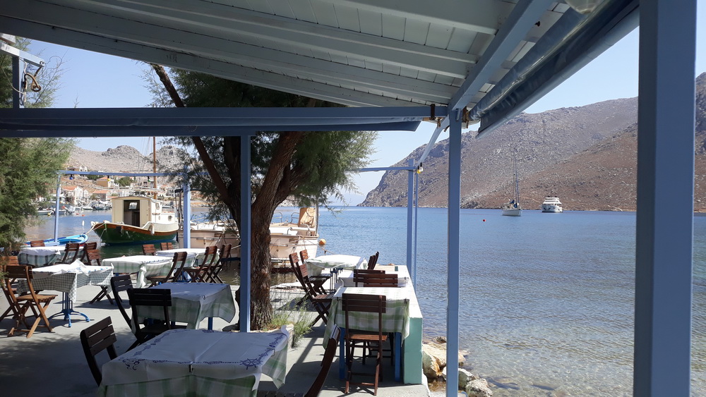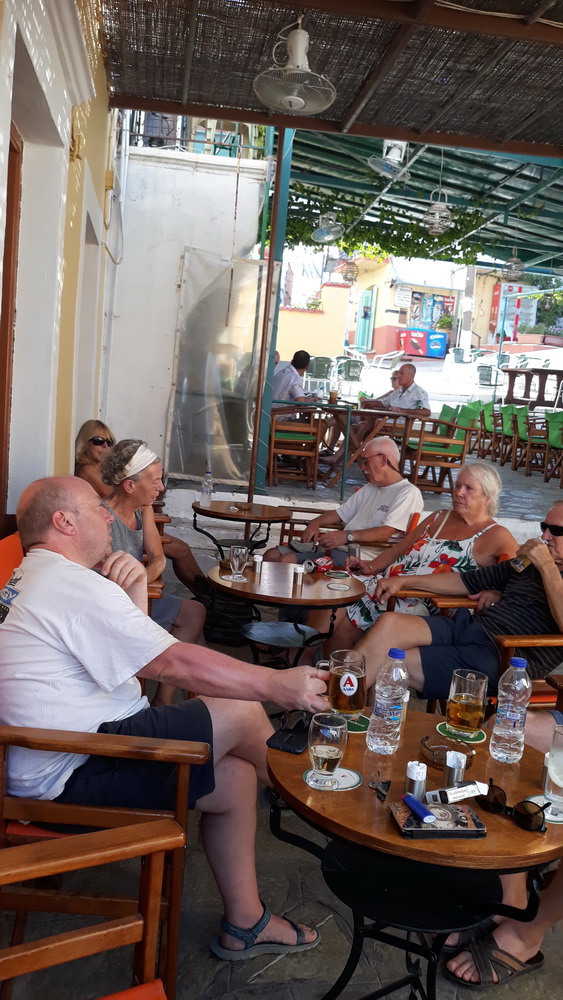 Completely unrelated, but that night, one of Neil’s crowns fell out leaving him toothless. What do you do? Send your dentist a photo, put the crown in an envelope, and pop down the next morning and have it fixed by 10.30. That’s Symi living for you. Meanwhile, Godson #1 came to do the cleaning and earn his coffee money, I finished off reading the last draft of ‘One of a Pair’ and wrote a blog post about what I am currently working on (click here). Later, it was salad and chicken in front of MasterChef (Aus), and then back to work. The day was cooler thanks to a mighty wind which had blown half the courtyard into the house, and down at the bar, threw as something of a gathering of regular visitors at distances and the usual malarkey.