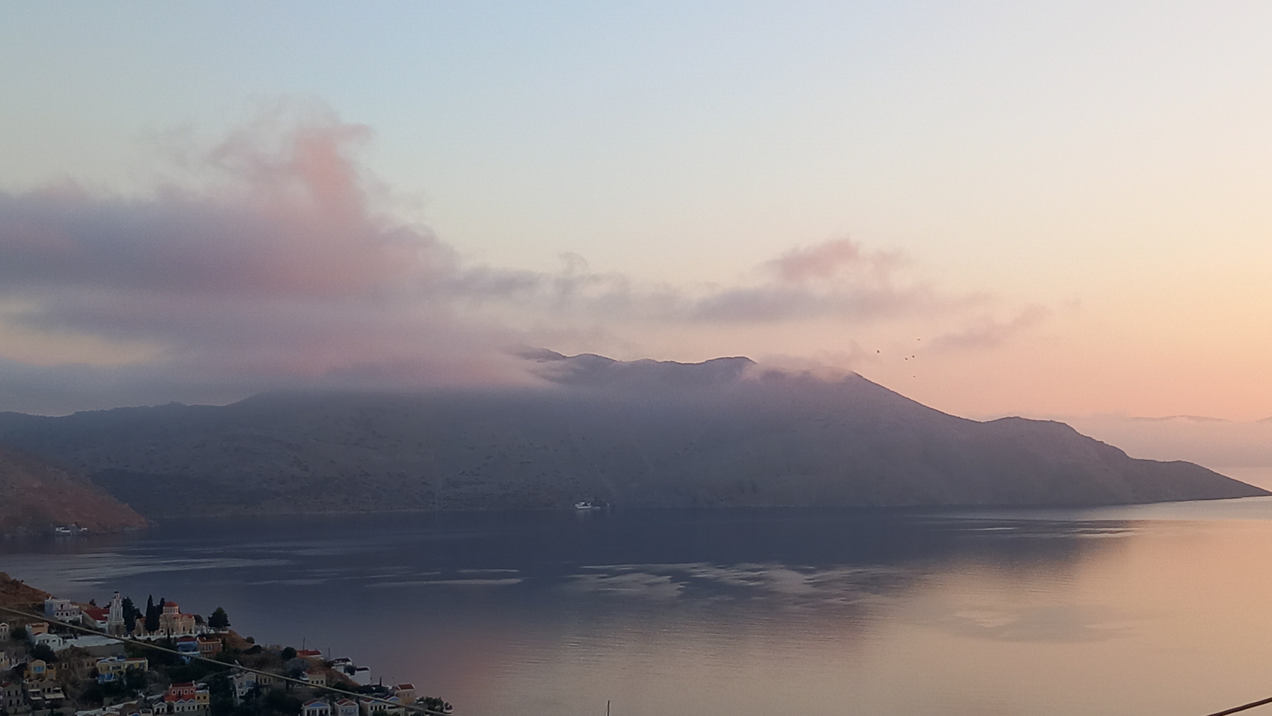 Sunday started so humid I could smell the moisture in the air. I’ve noticed it before over the years, the smell of damp rock that somehow holds a tang of dust. The balcony rail was wet, always a sign that the weather is sultry, and there was a cloud blanketing the Turkish coast, and another hanging over Nimos. Not a rain cloud, I suspect, but a cloud of humidity, almost a fog John Carpenter would approve of.