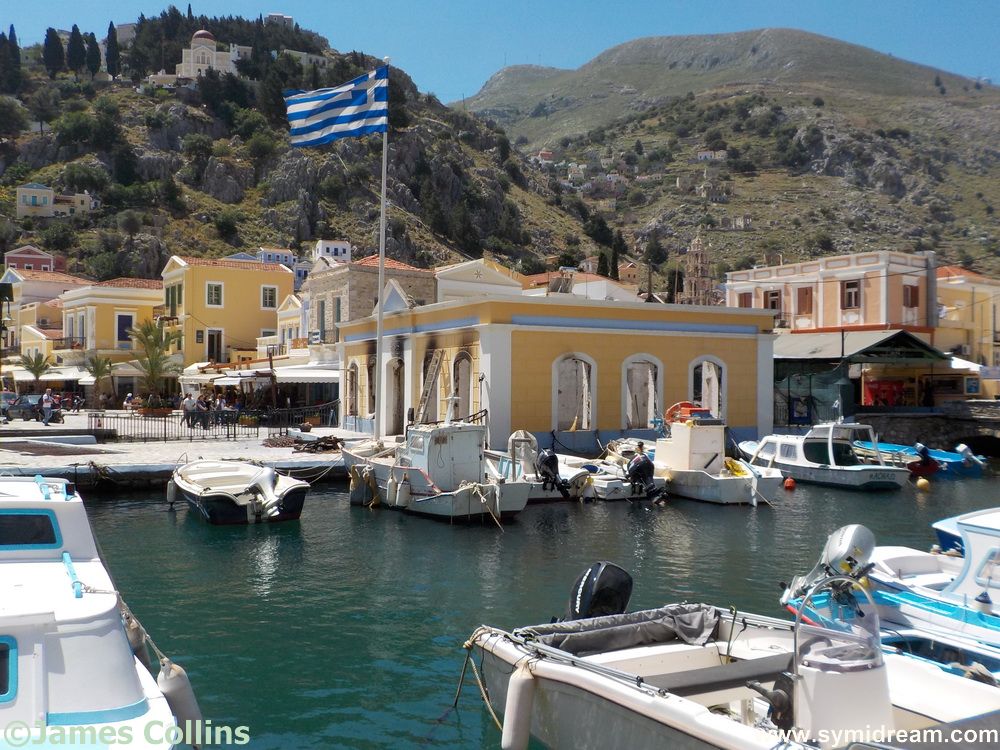 But, down in the harbour. Work has started to clear the customs house building that went up in flames last week, and the flag is still flying high above it, as it did throughout the fire – very Greek spirited of it I thought. I’m not sure what the rebuild timeline might be, time will tell, but there was a group of workers there working hard as I passed. It was one of those mornings of saying ‘Kalimera’ to everyone; on the steps going down, around the harbour (the new bar staff in certain places have finally realised I am not going away, I’m not a day-tripper and don’t need the ‘please come in’ dialogue). Around to the bank, and passing Takis’ leather shop (six kalimeras needed there to greet all his staff) and up and down the other side of the harbour.