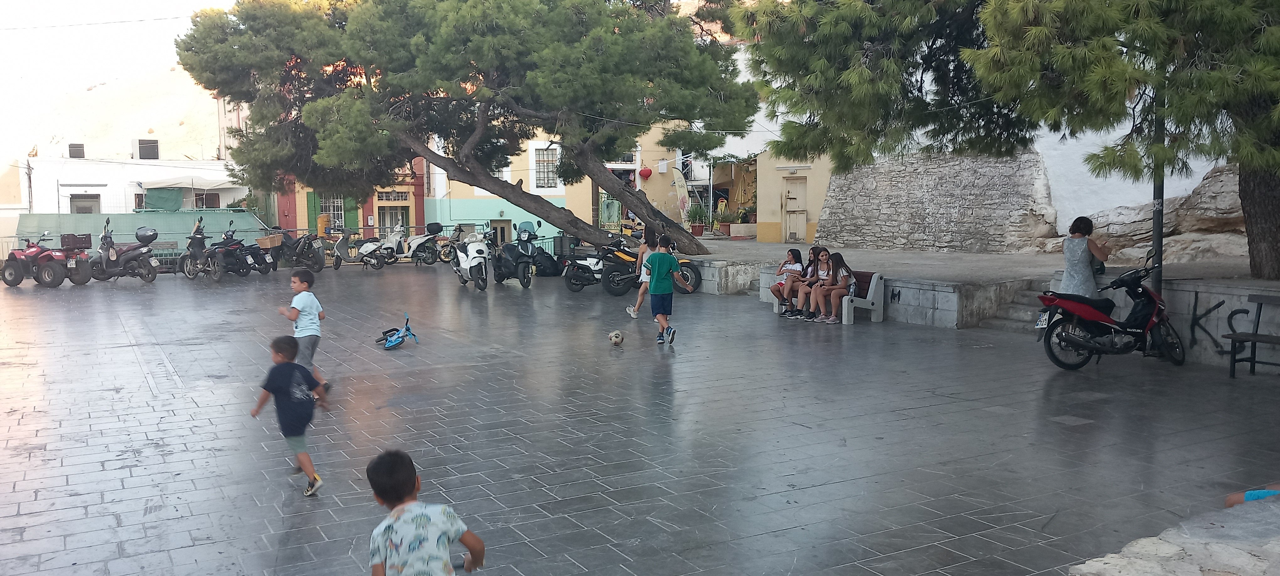 I do have an up-to-date photo as well, taken yesterday evening as we were crossing the square, showing some of the local children at their games. This photo could have been taken 40 years ago in any other country where it was once safe for children to play out alone, like we used to do. It reminded me of the times people from the UK ask what time zone we are in here in Greece. I always say we’re two hours ahead and 40 years behind – in a good way.