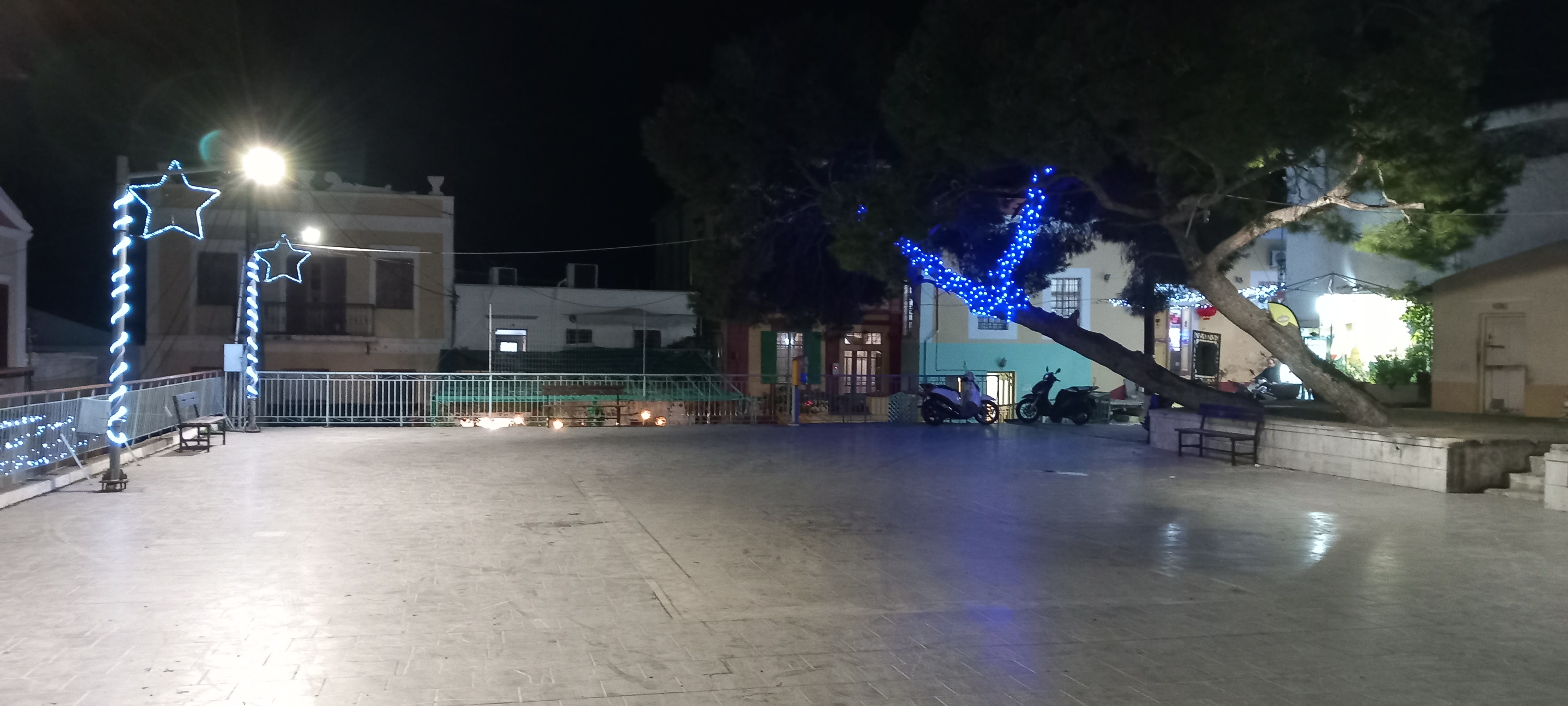 Continuing the Christmas build-up theme, here’s a photo of some of the lights in the village square. The ones I showed you yesterday, going along the lane, now go all the way to Taverna Zoi, so we have a twinkling path all the way from Georgio’s to the ‘American’ supermarket. Walking that way last night, Neil reflected on how many businesses there used to be along the lane, what with the bookshop, clothes shop, seamstress, cobbler, toy shop and others all now gone. Only some have been replaced by new businesses, while other premises stay closed. There’s some work going on in what was the household shop run by Mr Plastic as some called him (because of the things he used to sell), which then became the butchers’ shop (not the new one, the boys are still there and doing well), but I’m not sure what the work will be leading to.