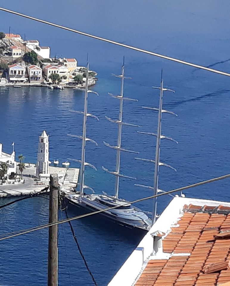 There has been a massive yacht in the harbour for a couple of days. A three-masted, modern thing that, apparently, costs €44,000 per week to hire, or something similar. I guess you have to pay for fuel and food on top of that, plus staff tips, so it’s not something we’re likely to be using in the near future. Neil took a snap of it from the balcony the other day, and others were doing the rounds on Fakebook.