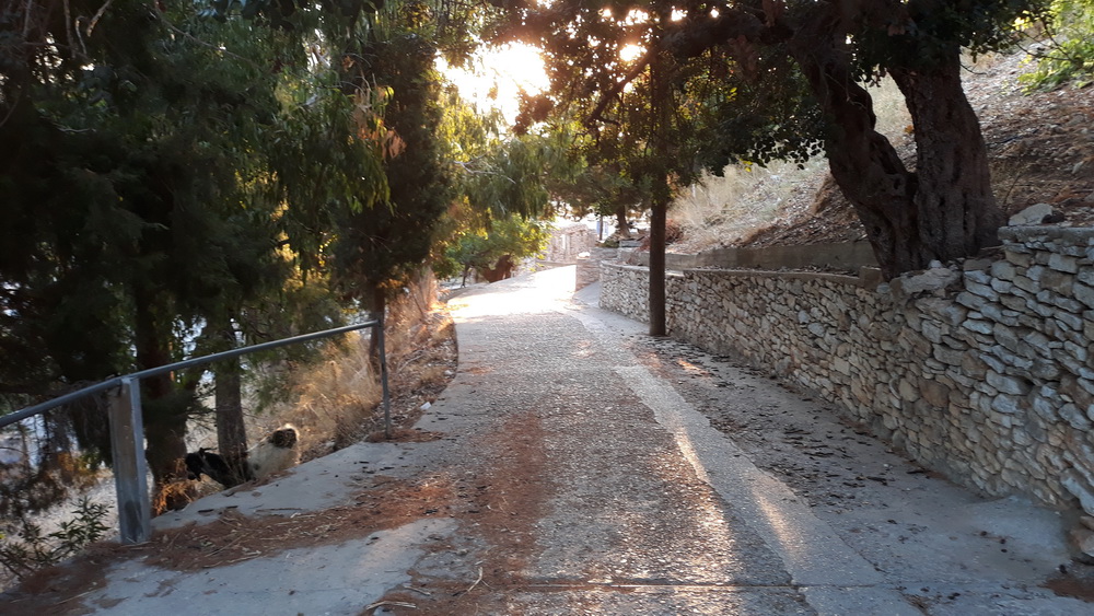 There were also several goats rummaging around in ruins climbing trees and on roofs and causing a bit of a racket. There are always goats around somewhere. Our lane is becoming quite the petting zoo these days. There are goats up the lane wandering free, the bin cats of course and their scraggy kittens, and also the chickens with their chicks. They were hiding behind a bin when I went past, so I couldn’t get a photo, but I could hear them, and I saw them the other day when I didn’t have the camera with me. Obviously, the cats aren’t interested in eating them, and the chickens and their chicks are not bothered by the cats, so everyone seems to be getting along quite nicely. Spot the goat (that’s not his name, as far as I know).