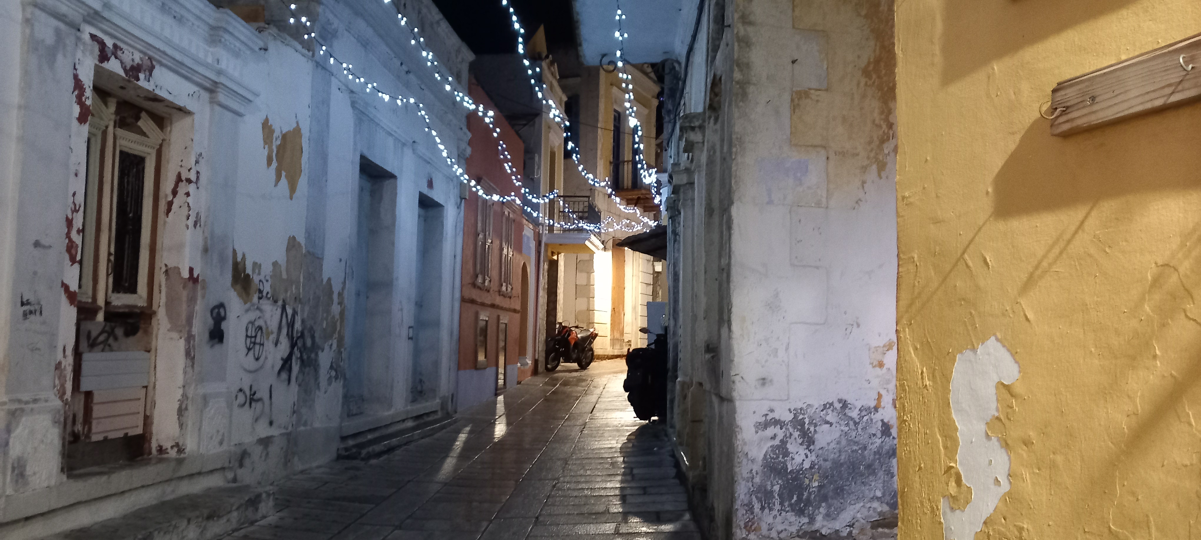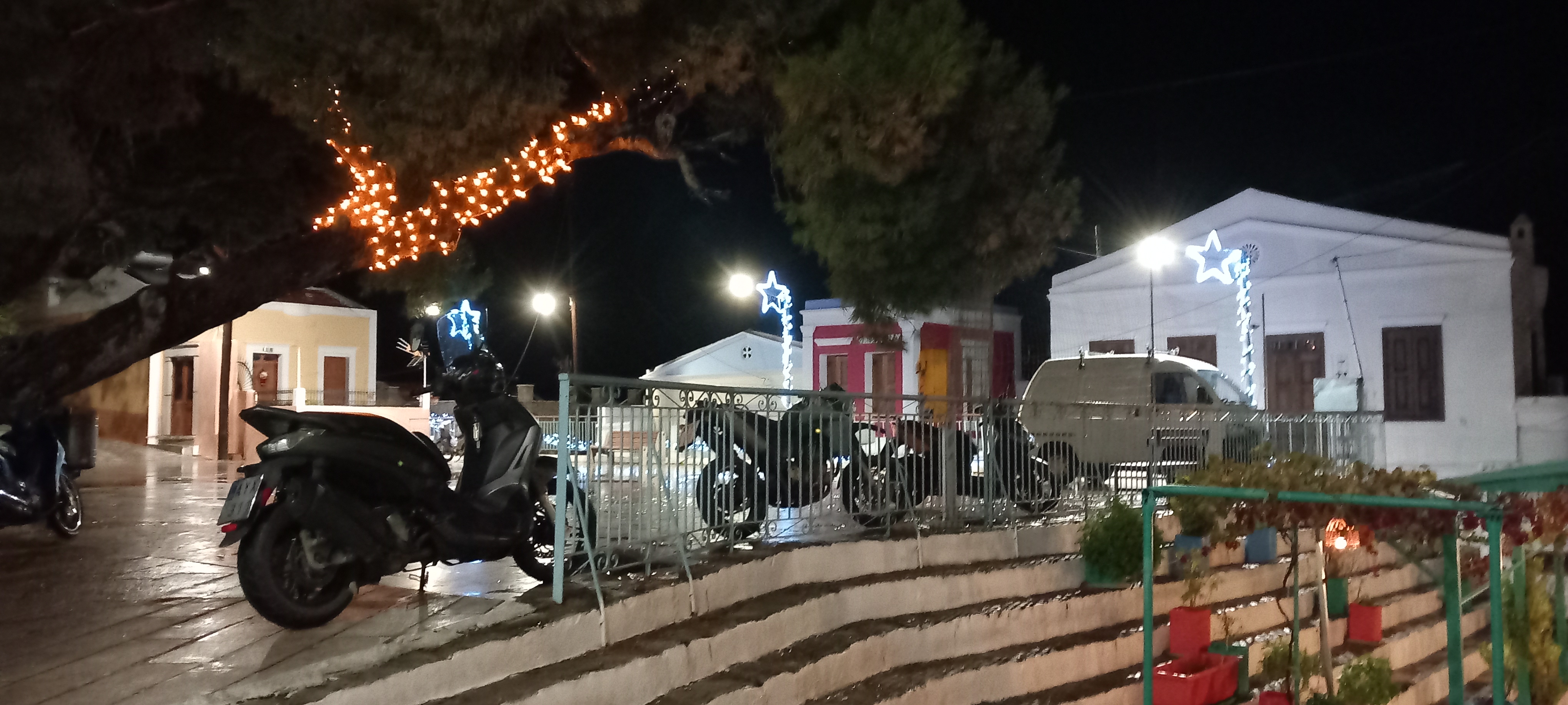 While out in the street, the square remains mainly empty because it’s not really playing out time of the year for the youngsters. The lanes tend to be very quiet and sometimes even a little eerie at nighttime. It’s not particularly cold, so it’s not that that’s keeping everyone inside. In fact, many people are out and about, especially down in Yialos where the Christmas festivities continue in the main square. Up here, though, you can walk beneath the Christmas lights all the way to the supermarket and back and not see a soul.