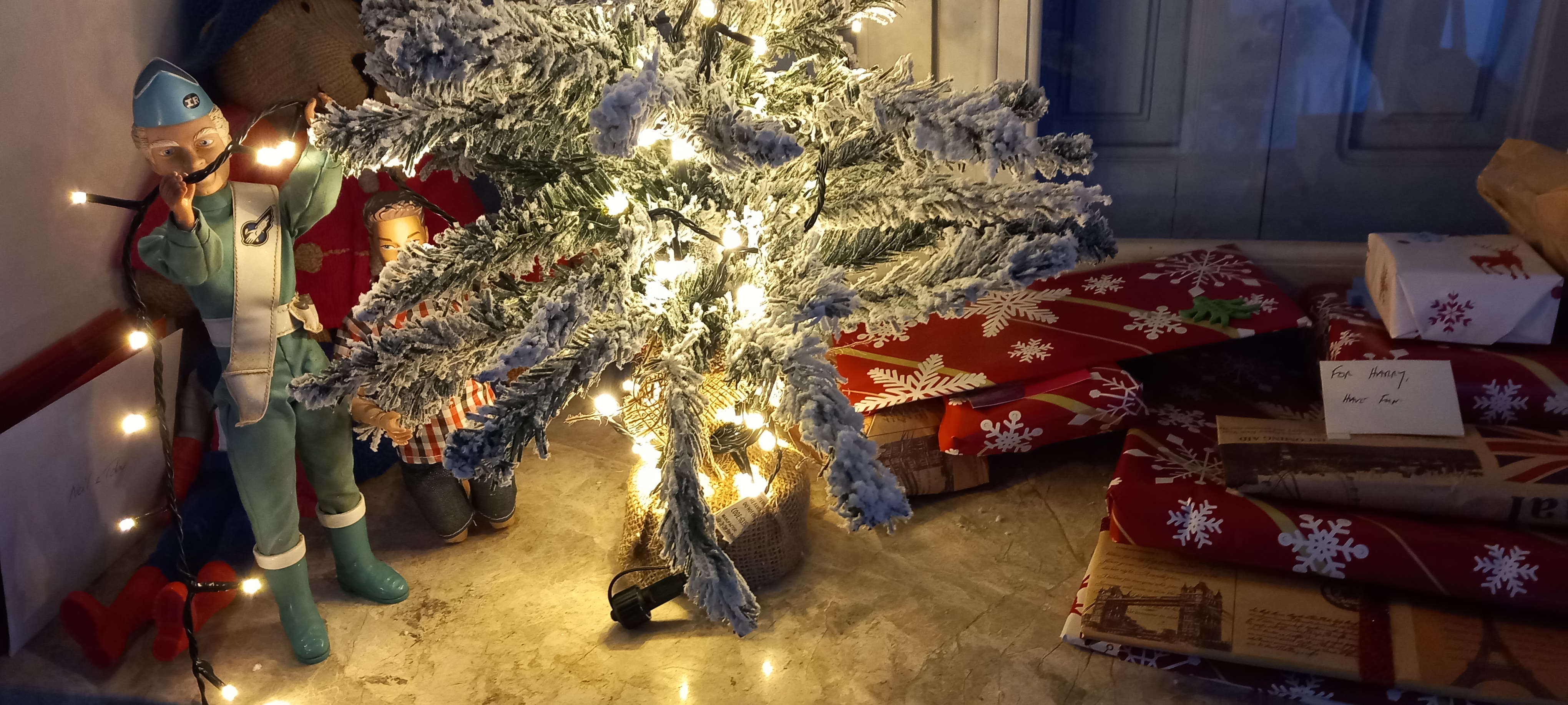 Back home, I’ve wrapped everything that has so far arrived, and hope to have the last wrappables delivered this afternoon when pianissimo comes for his piano lesson and brings them with him. If I’m very lucky, my glasses will be among them, and I’ll have better vision. (Oddly, for a Thursday, I can hear the mains water coming in and filling our tank. Not complaining.) I’ve put my collection of oddments beneath the tree, or next to it, because it’s not a huge tree. We had to call in help when it came to putting the lights on, though.
