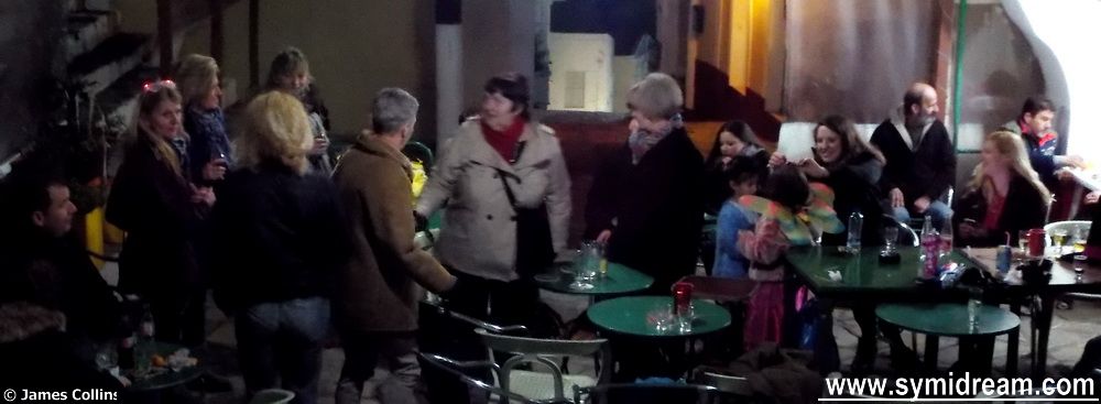We’d been down to Yialos in the afternoon to get the rent money out, called in to see Takis who is working on his latest masterpiece, and then walked back up. Jenine had called to say the party was on, so we met up for a pre-party drink at Mandeio’s and then headed to the square.