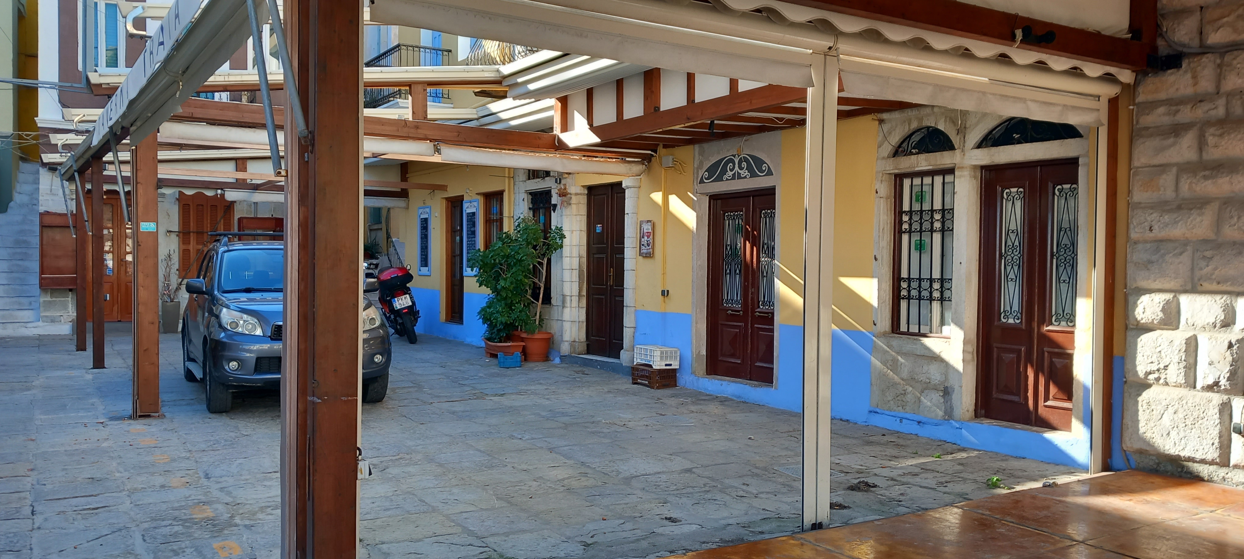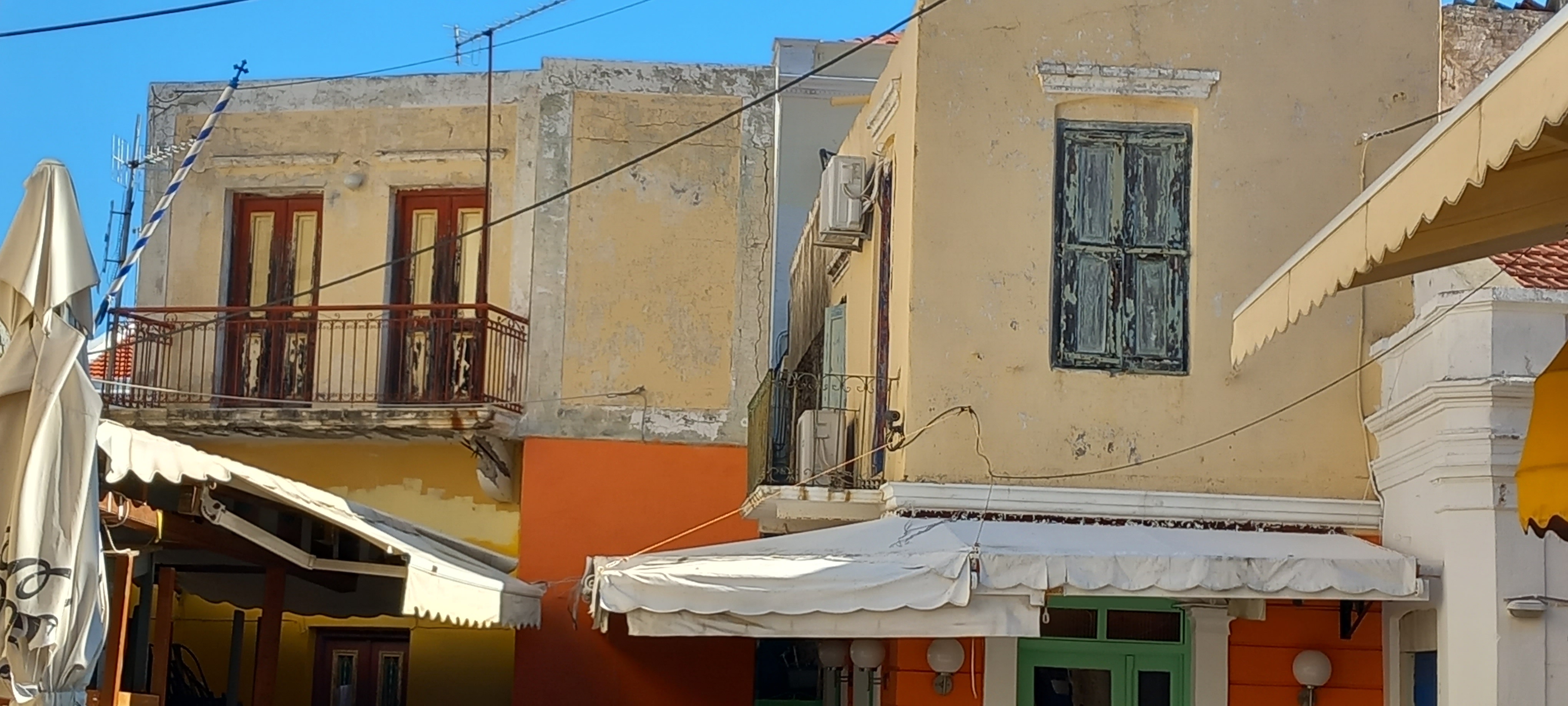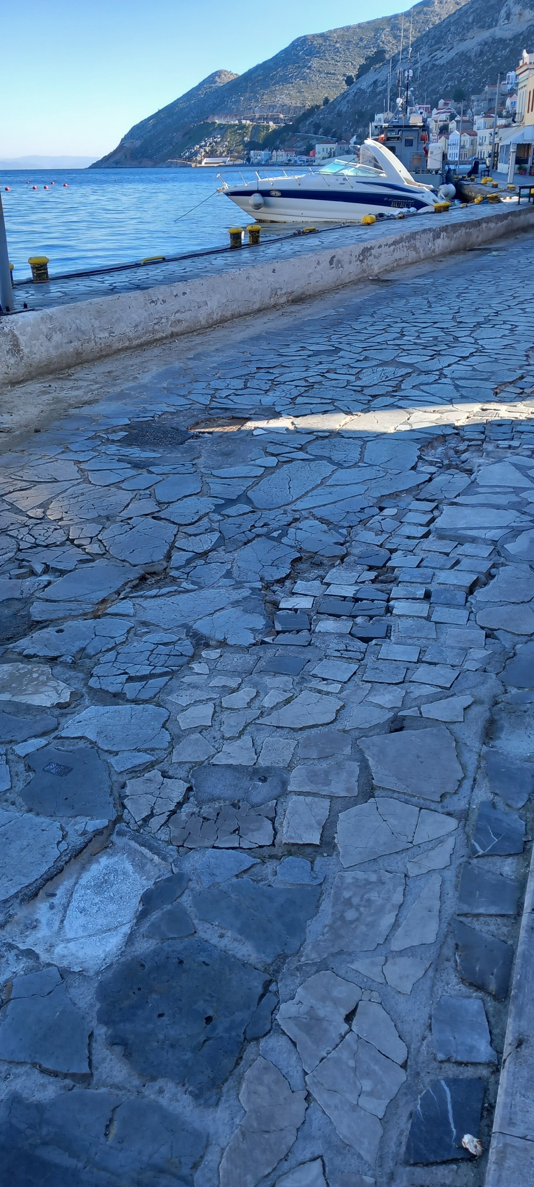 Just a few photos today as I don’t have any news to tell you, not unless you want to read that I have put an undercoat on the bathroom window ahead of painting it later today. That’s about as exciting as it got around our house yesterday, so here are a few shots of Yialos instead. If you’ve eaten at the Trata (Trawler) you might like to see what it looks like in winter. If you’ve ever walked on the road, you might have wondered if it will ever be repaired decently. And, if you have ever walked around the backstreets and alleyways, have you ever looked up to see what you are missing above?