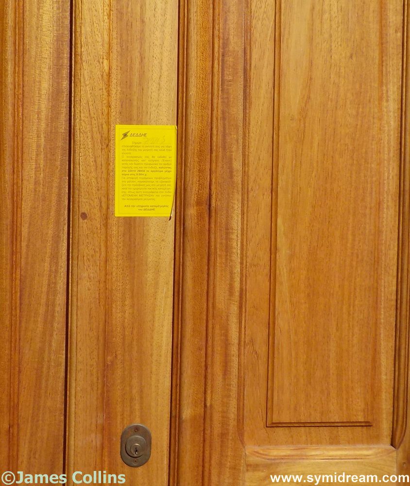 If you’ve ever been to Symi (or elsewhere in Greece) and seen these yellow stickers on doors (see below) and wondered what they are… They are left behind by the electricity meter reader on his rounds. If he doesn’t find anyone at home when he calls to read the meter, he leaves one of these on your door; they can be very hard to remove. I’m pleased to say we’ve never had to try and get one off, I make a note in my diary of when then visit is due (it tells you on your bill) and then just leave the courtyard gate open for him on that morning as our meter is in the courtyard. Just thought you’d be interested. Have a good day.