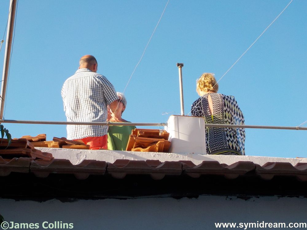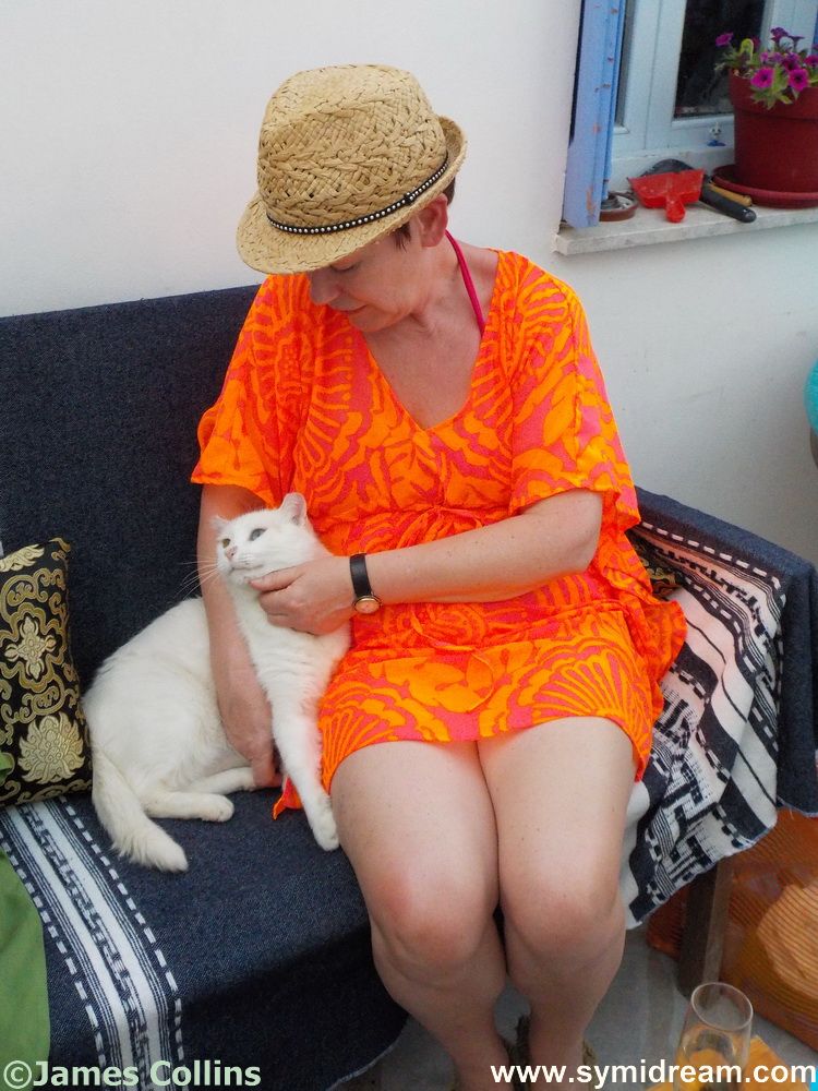 Down in Symi town I can see the boats a coming and a going and life going on as usual. The soldiers have done their Sunday morning ritual at the war memorial, we can hear them singing from up here – they also come back in the evening to lower the flag. The tail end of some further-north thunderstorms has passed us by with a little cloud the other day, but now normal service has been resumed. The Poseidon is going out on its round the island boat trips, the shops and cafes are all open, the tavernas and bars too. At the house, the plants are growing (all but one) though the chilli seeds haven’t come up yet, the cat is still shedding more fur than he owns, somehow, and I spent 40 minutes hoovering the sofa on Saturday and it’s already attracting more white fur. Viv brushed off four handfuls on Saturday night and no doubt I could get the same from him today. Mind you, he does look much thinner after a good brushing.