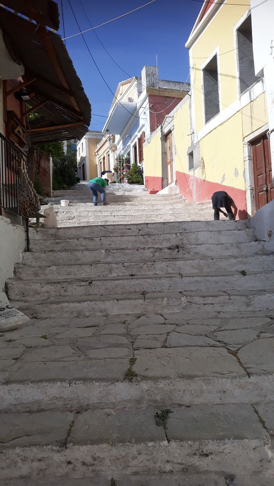 And, again, from a few days ago, the guys preparing the Kali Strata for painting. This is done every spring. The weeds are removed, and paint is slapped on the risers, brightening up the steps, ready for summer. A lot of the time, it rains a few days later, and the pristine white becomes discoloured by the dust and mud washed down, or someone empties a washing machine on the steps and leaves a stain, but for a while, the steps dazzle in the sunlight. We’ve not had much rain this spring, so maybe they will stay whiter than usual this year.