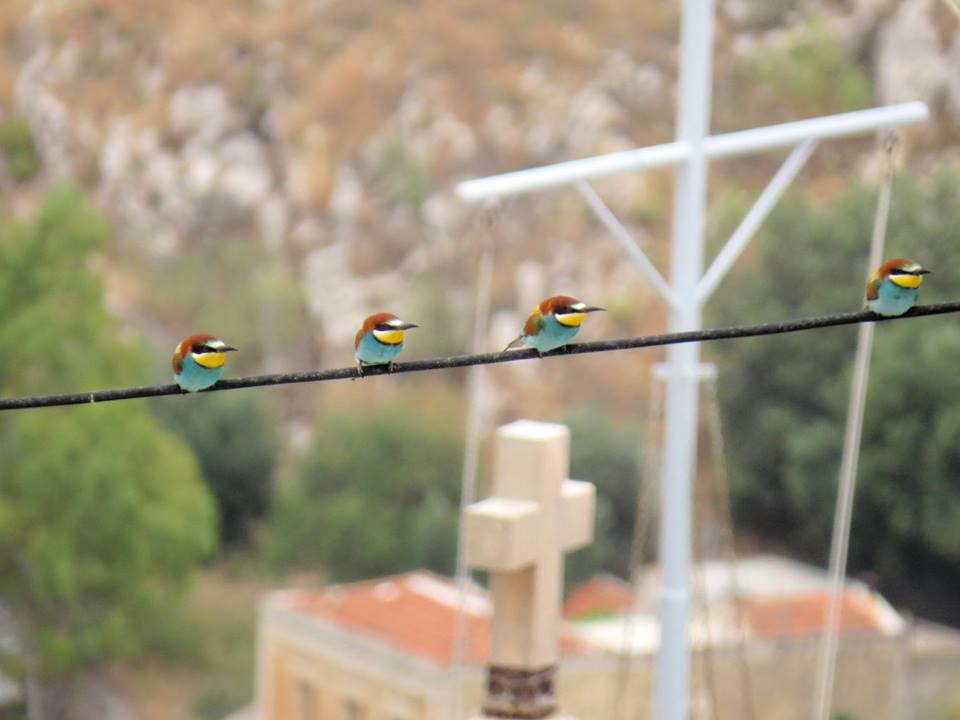 I’m not here. At least I hope I am not here. It’s Saturday morning (it’s actually Friday morning) and I should be in Tilos by now. As long as the boat comes in tonight and doesn’t break down then all should be well. As it’s a Symi Saturday, today’s update from the desk is mainly about the photos (well, it was meant to be, but I rambled on a bit) starting with this stunning one Lyndon took of Bee-eaters on a wire in the wind.