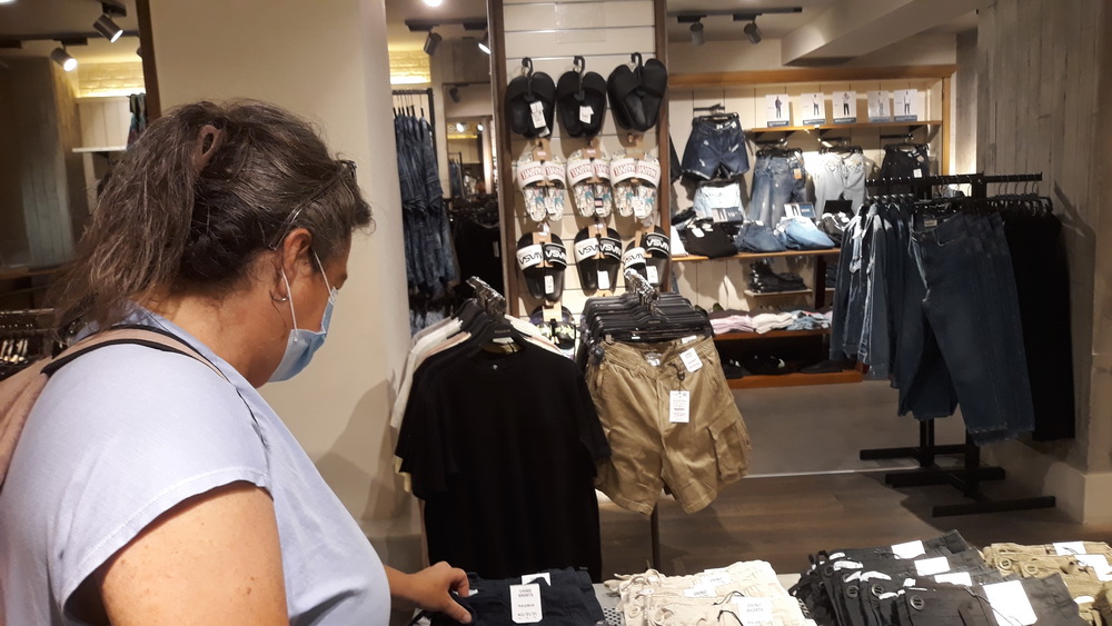 After the fingerprinting was done, I had plenty of time before my next appointment, so we wandered around a little while, window shopping and bumping up the step-counter on my phone. I think we’d already walked four miles by then, and we were to manage 10 by the end of the day. A walk along the seafront showed hundreds of sunbeds, mostly empty at that time of day, with a good few meters between each umbrella and people already at work waiting for custom. As the morning went on, the streets became busier, but still not as busy as they would have been in ‘normal’ times. Later, there was time for shopping, and I needed new shorts and shirts, because last year, I didn’t bother as there was nowhere to go apart from the Rainbow Bar (which opened yesterday, btw). So, my personal shopper took me hunting in various clothes shops.