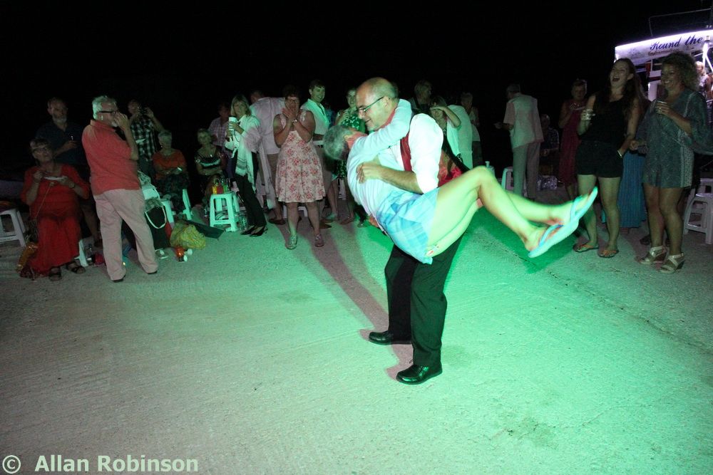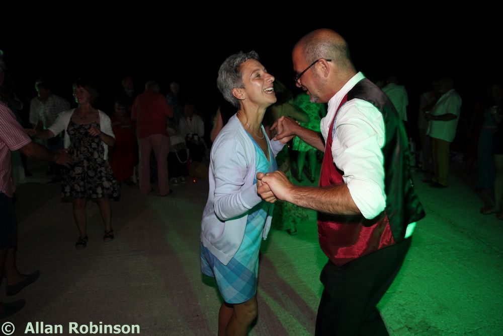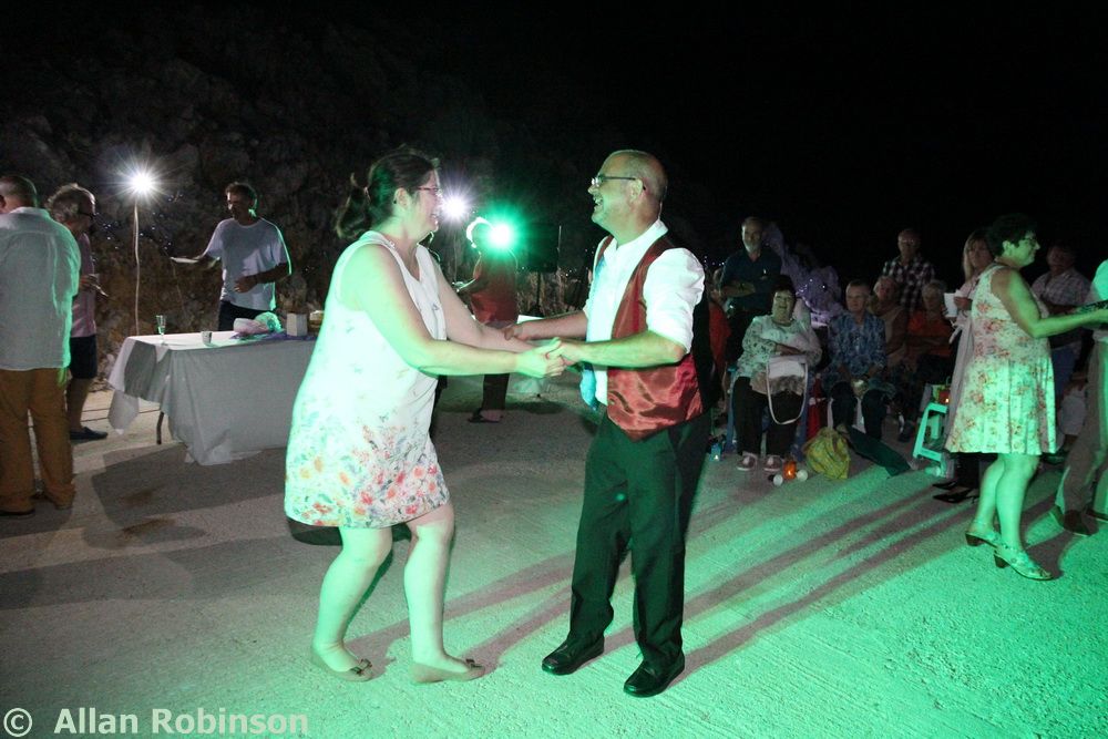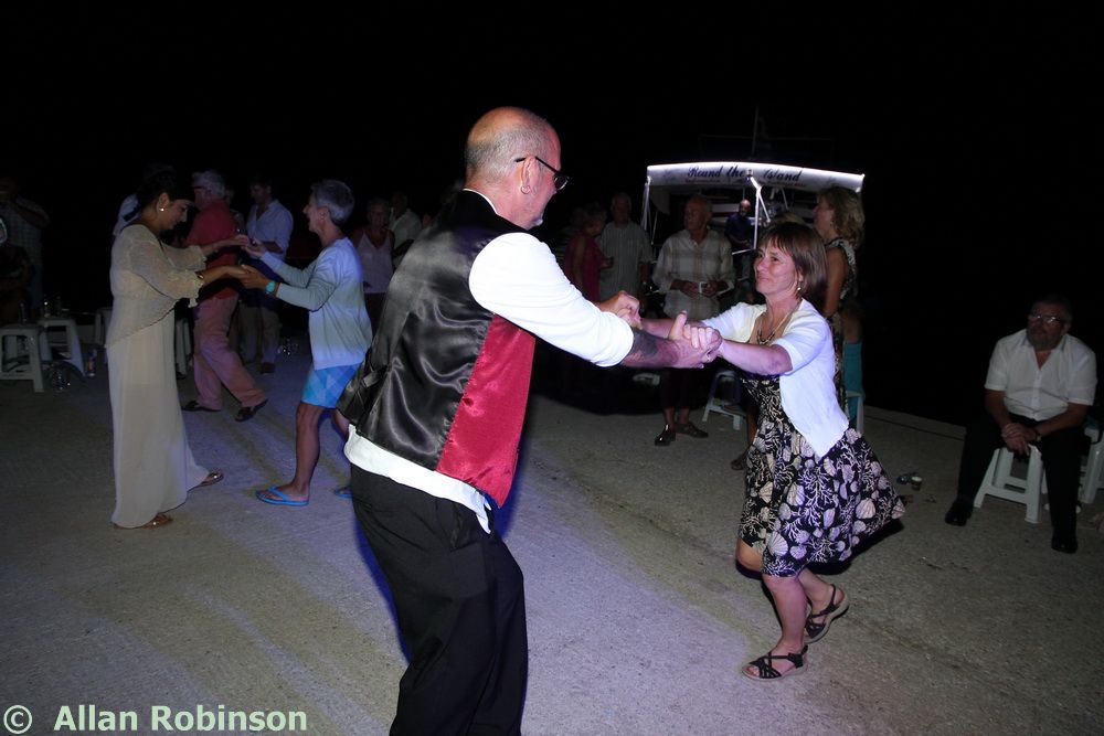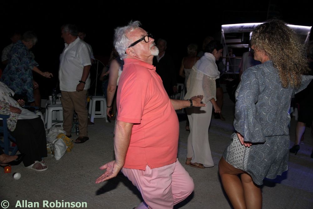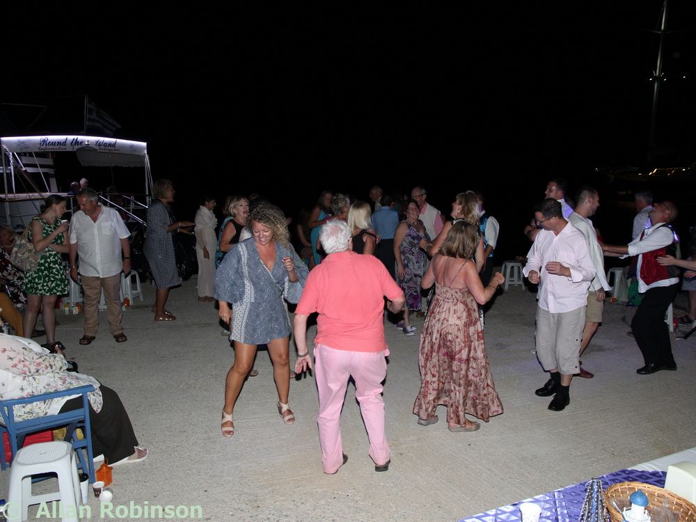 The music we had chosen for the evening was varied. My Symi Dreams album of piano impros was played while everyone was setting up, there were a couple of my own songs involved, as I’ve said, and a selection of numbers that meant something to us. These ranged from Neil’s classic birthday song ‘Let me Entertain you’ by Robbie Williams, to ‘The Rhythm of Life’ from Sweet Charity, a fav of mine, and from the Steve Miller Band to The Monster Mash. When I was about 15, I played in a swing band and we appeared on ‘Swap Shop’ playing ‘Pennsylvania 6500’ so we played that number too. But musically, for me, there were two special moments. One was playing music by my best school friend, Andrew T MacKay, now an important composer of film and other music in India; we had this playing on the way back from Taviri, crossing the flat-calm sea on the boat with the lights of Symi twinkling us safely into port. The other was a number called ‘Nou’s Blue’ composed and arranged by my brother and recorded by him and his band. My mother and I danced to this; another special moment.