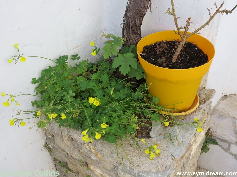 Monday’s breeze blew into a wind in the evening but calmed during Tuesday morning to once again leave us warm and calm. The sun came out and the sky, although not yet the painted blue of summer, was reasonably cloudless though a bit pale. Spring flowers are out still, even the weeds are attractive at this time of year and our courtyard plants, such as they are, are coming along. The chilli is growing, and now I’ve separated some other plants and thinned them out a bit, they are also doing well, and the vine is growing at the rate of about two inches per day. Spring is still springing here on Symi.