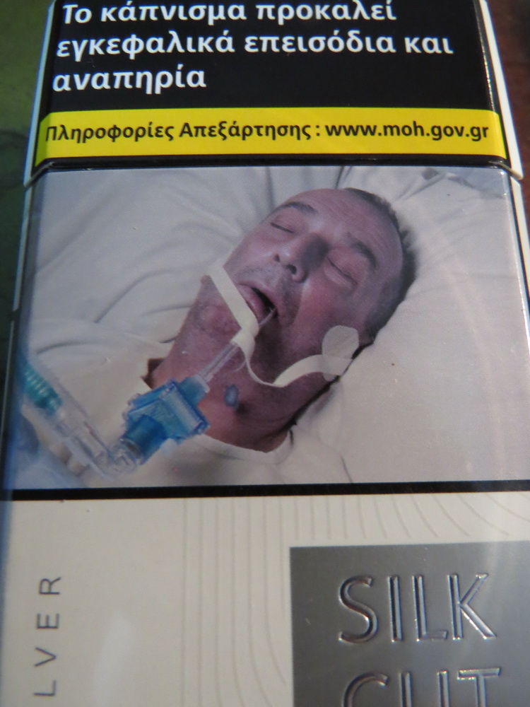 Cigarette packets. Even here in Greece ‘they’ (whoever the ubiquitous ‘they’ are) are putting images on cigarette packets, to deter smokers from buying them I guess. This is a bit naughty (what I am about to write, not the habit of putting shocking images on packets), but I can’t help feeling that if one collected enough of these things, one could start a game of trumps.