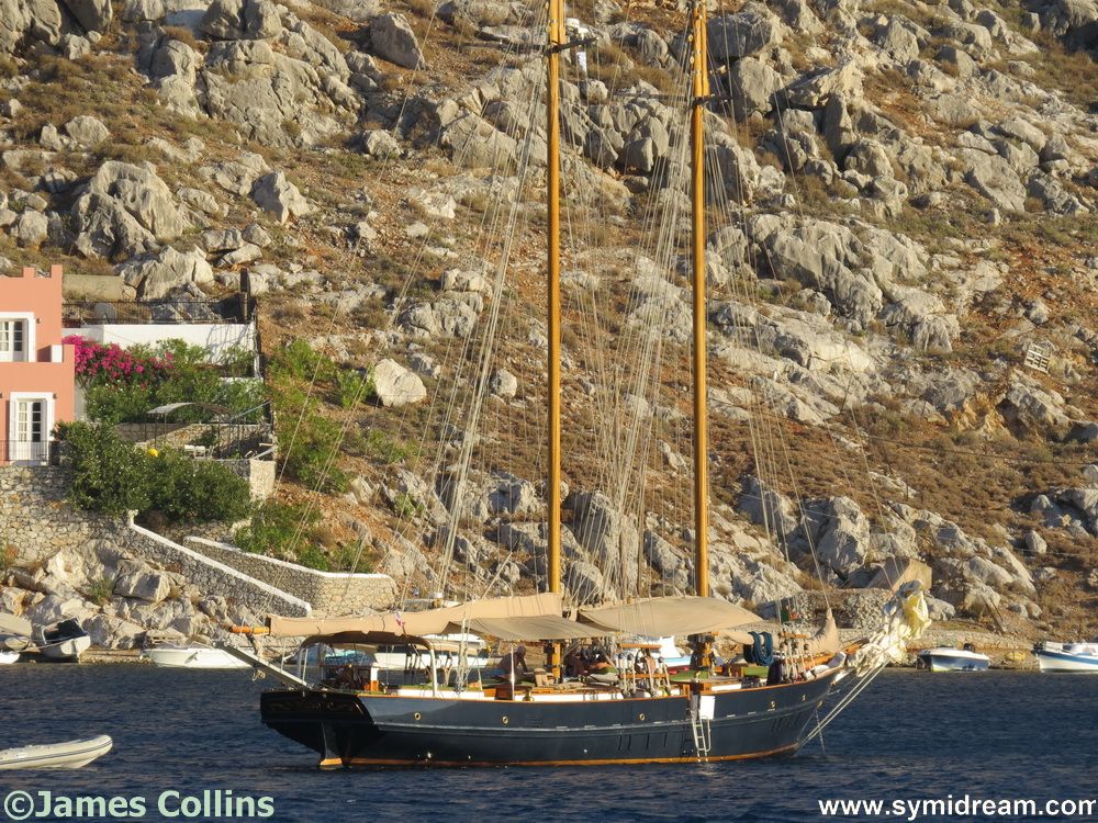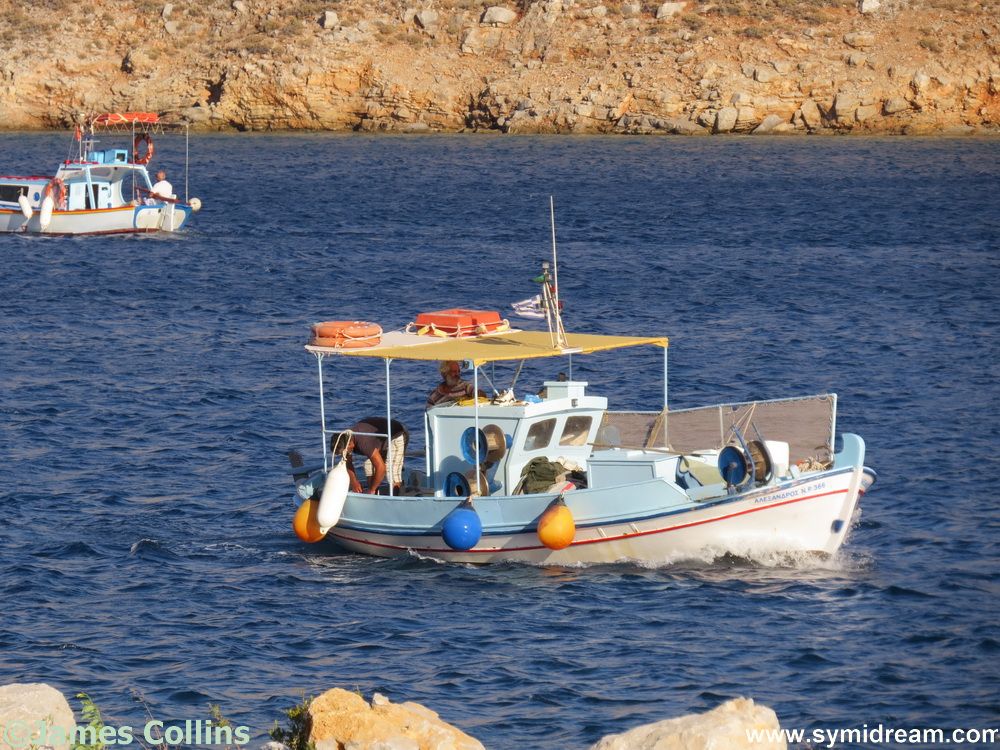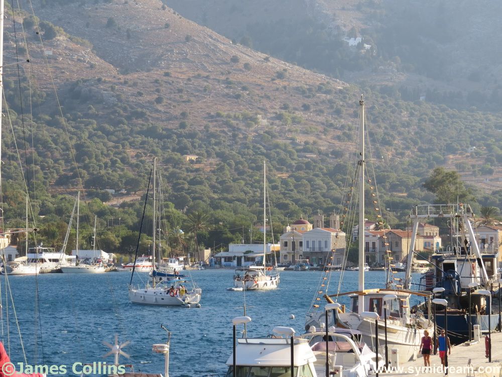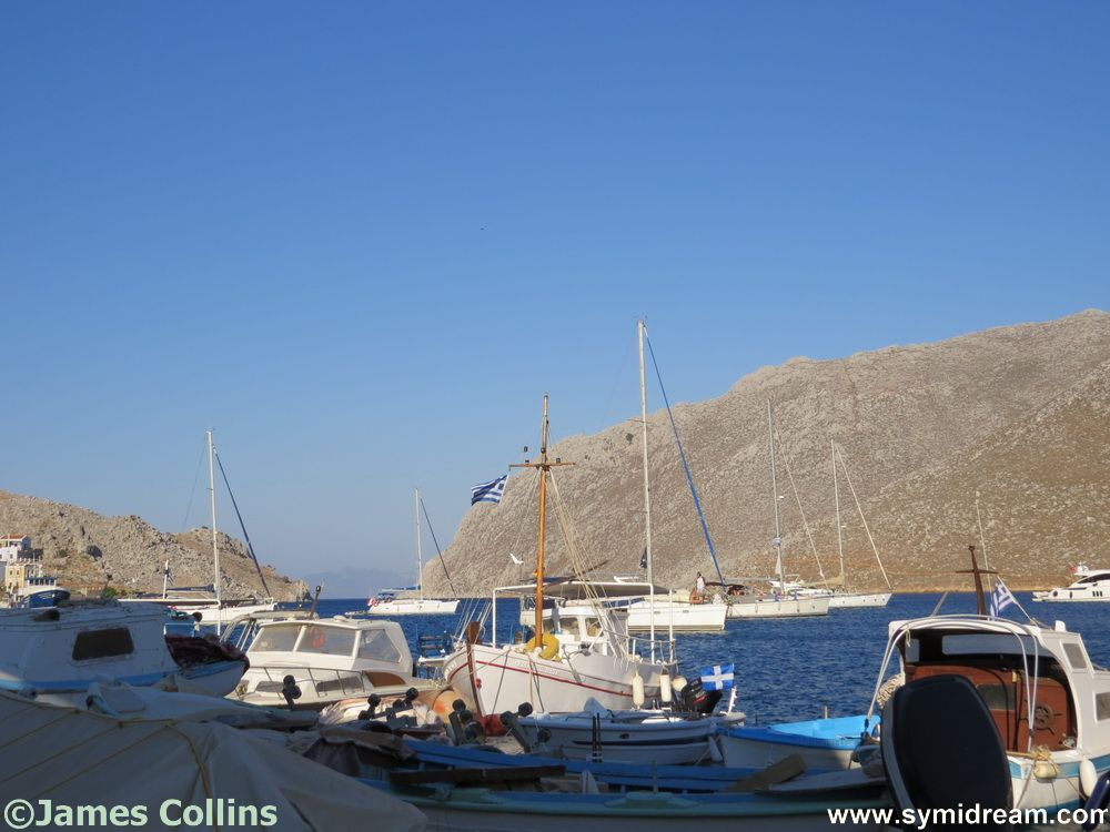 Today’s photos are from Pedi on Saturday evening when we went down to have supper with some friends there. (Thank you!) We walked down and back, there was quite a breeze blowing in the early evening which calmed later, making for a pleasant walk, though still a hot one. Sunday dawned bright and clear, and I heard the soldiers singing the national anthem as they raised the flag at eight in the morning. If you are on Symi on a Sunday morning and up and about in Yialos, you will be able to see them perform this ceremony as they do it every week. You will no doubt hear them too.